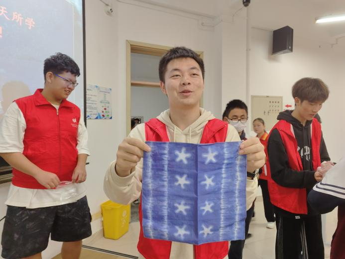 在别具意味的扎染科普课堂上,同学们在志愿者的细致讲解、耐心指导和紧密合作下,发挥自己的奇思妙想,将捆扎好的织布放入染料盒中,经过浸染、晾晒后,一幅幅别出心裁的扎染作品制作而成。简约的作品却蕴含着巧思与期盼,每位同学在辅导老师的指导下,争相为自己的作品起了与党的二十大报告要义相连的名字:一带一路、美丽、团结、自信、人类命运共同体......生动诠释着大中学生共同对二十大报告要义的理解与认知。