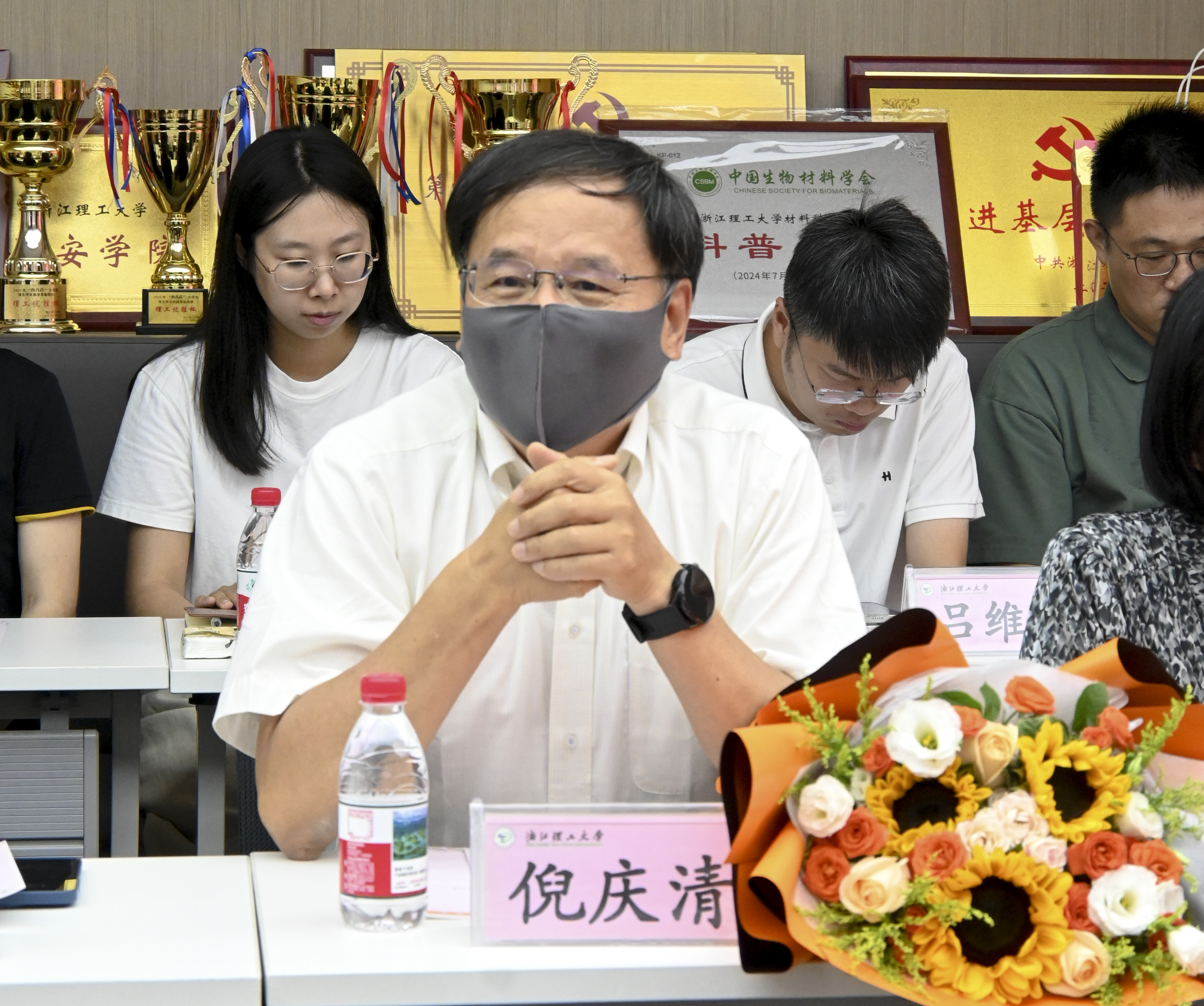 在“材料赞扬您”表彰环节,学院对2025年度在党务工作、教育教学、科研创新等方面取得突出成绩的教师代表予以表彰。仰滢、张先明为获奖教师代表献花,感谢他们为学院发展作出的卓越贡献。