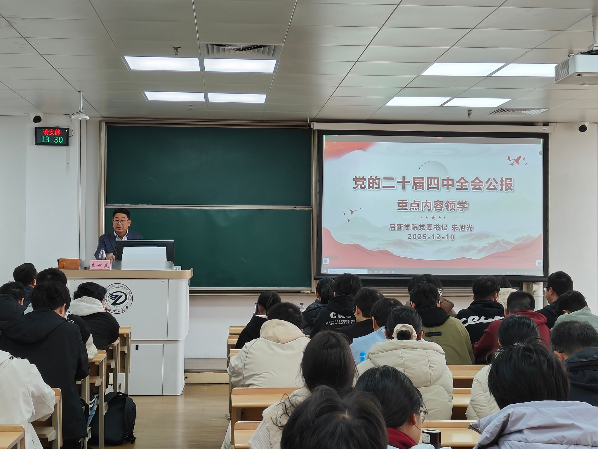 为深入学习党的二十届四中全会精神,引导学院师生筑牢思想根基、强化责任担当,12月10日下午在2号北楼416教室,启新学院院长兼党委书记朱旭光为全院师生党员、入党积极分子讲授了一堂生动的思政课。