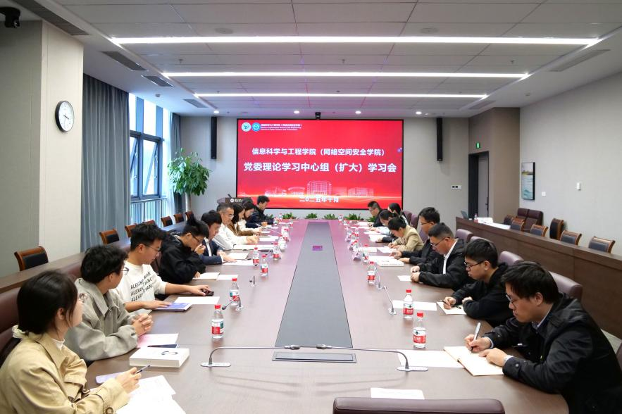 10月22日,信息科学与工程学院(网络空间安全学院)召开党委理论学习中心组(扩大)会议,围绕《习近平谈治国理政》第五卷开展专题学习。校党委委员、副校长姚菊明到会巡听并指导。