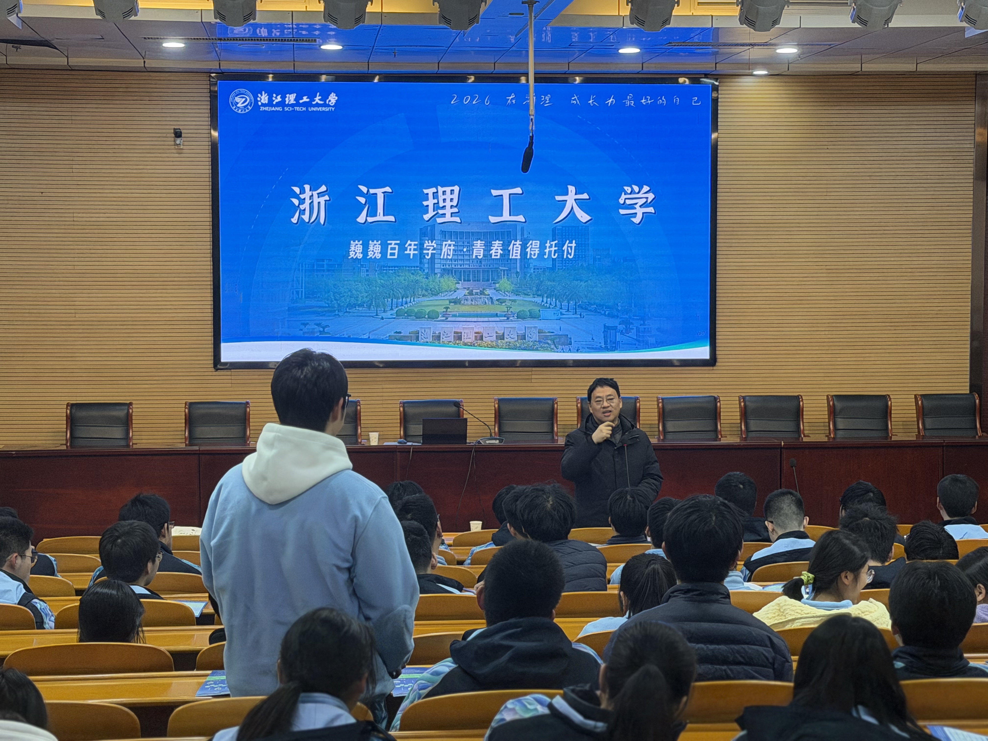 宣讲会上,夏青首先向在场师生介绍了浙江理工大学的百年历史文脉,通过展现学校的高水平教学科研平台、优势学科成果以及雄厚的师资力量,让在场学生感受到了学校为学生成长成才所提供的坚实保障;孔泽涛结合学校2026年“三位一体”综合评价招生章程,围绕“三位一体”招生政策、录取规则、专业设置等内容进行了详细解读,让学生对招生政策有了清晰、全面的认知;陈瑜结合自身学习生活经历,为学弟学妹们分享了大学生活的成长感悟,耐心解答了大家关于日常生活、专业学习、社团活动等方面的疑问,激发了学生对大学生活的向往。