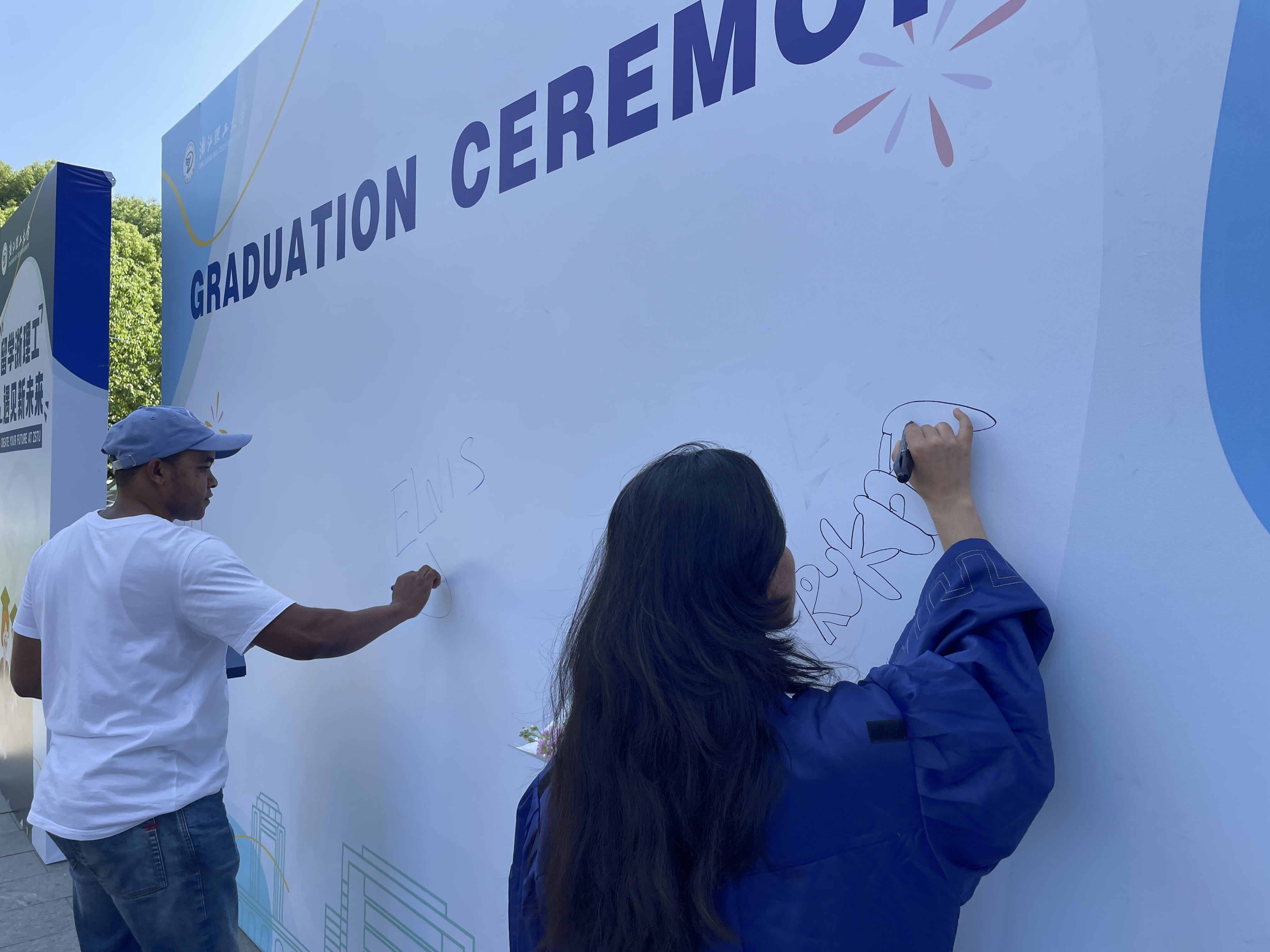 典礼前,国际学生们在签名墙上留下自己名字和毕业祝福,并合影留念,定格具有纪念意义的毕业时刻。每一位毕业生还收到了学校精心准备的围绕学校特色建筑创作的毕业礼物。