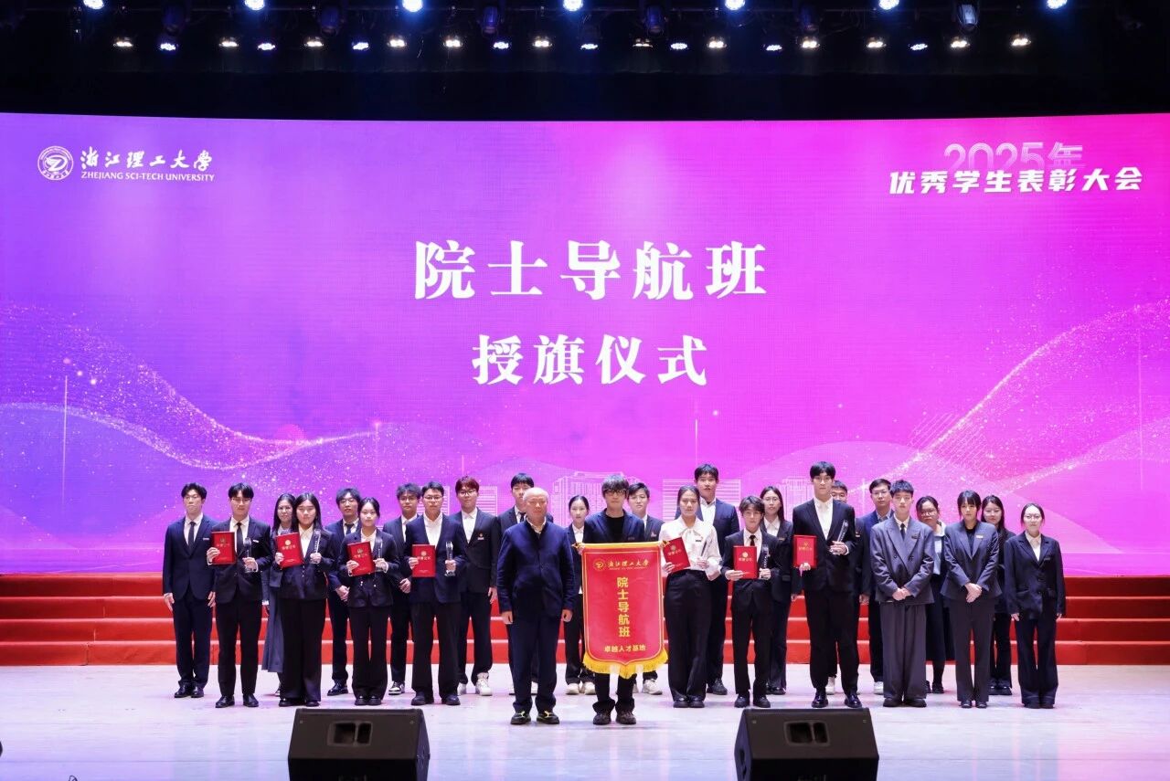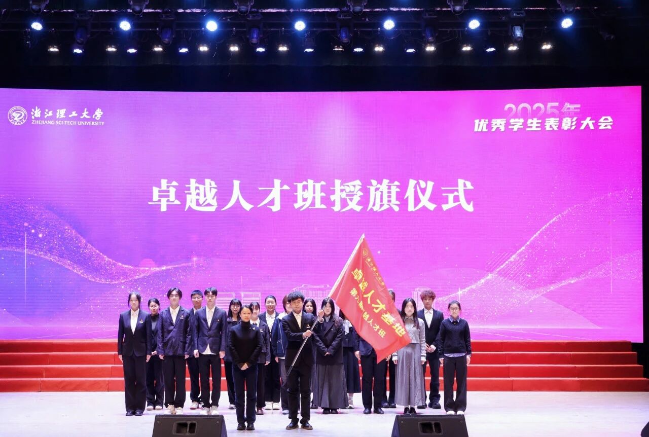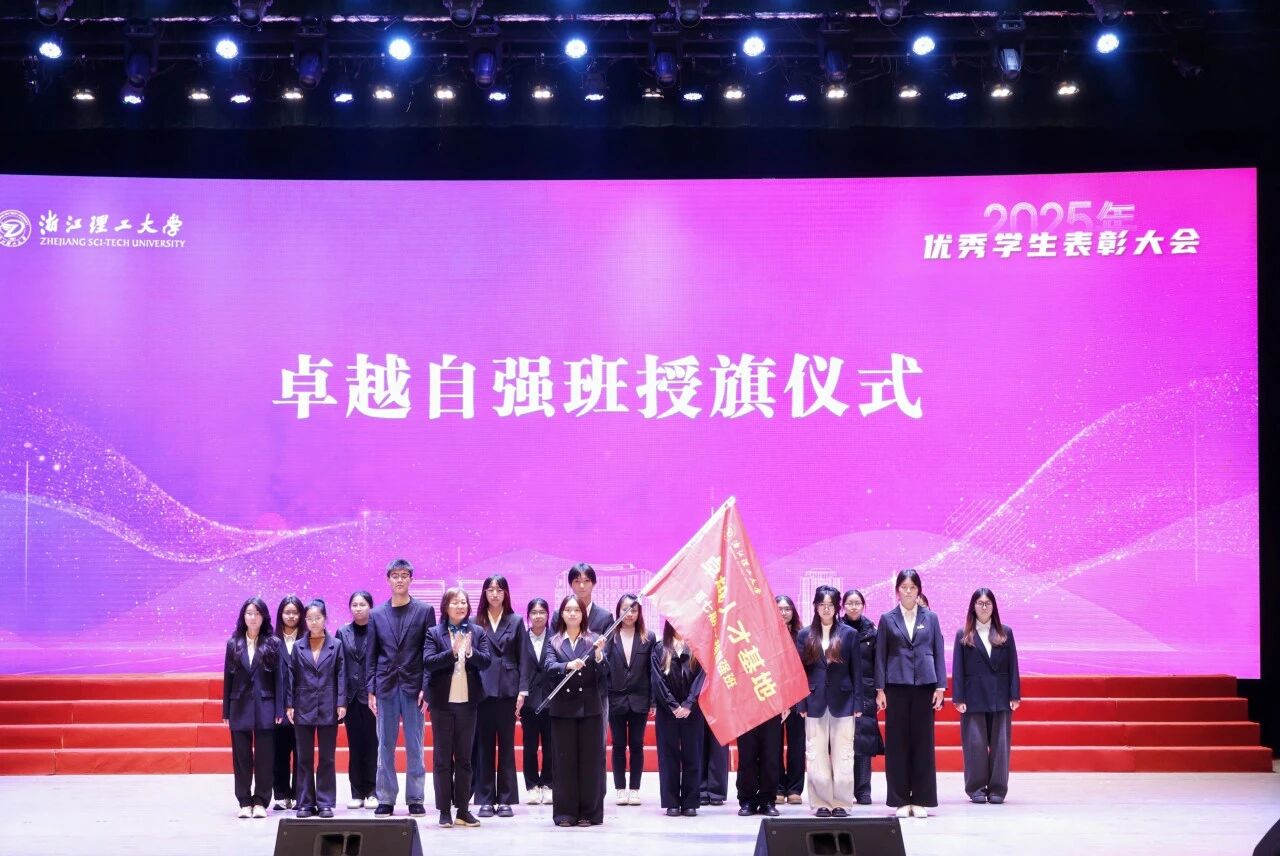 1977级丝织专业校友、杭州锦江集团董事长王元珞,对外联络办公室(校友办)负责人分别为卓越自强班、卓越人才班授旗。卓越自强班学员代表、经济管理学院本科生陈晓雪分享了她在浙理成长与蜕变的故事。