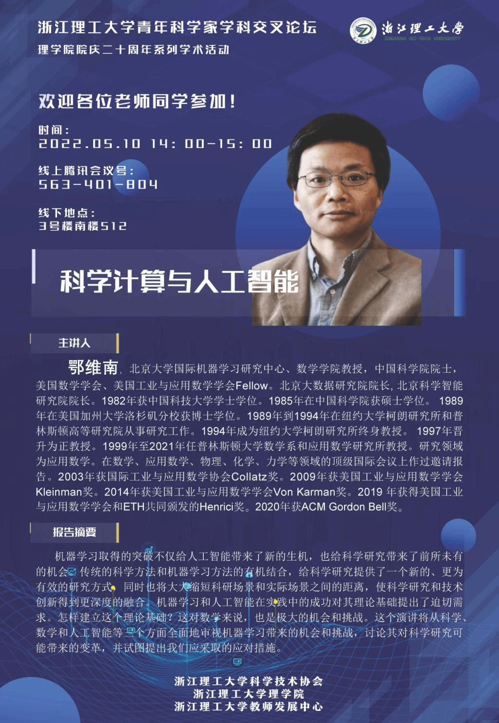 本年度首期青年科学家学科交叉论坛由理学院承办,将分三次举行,本期为第二讲。本次邀请的主讲嘉宾为北京大学国际机器学习研究中心、数学学院教授,中国科学院院士鄂维南,山西大学理论物理研究所副教授陈立,浙江理工大学信息学院副教授马汉杰。本期主题将围绕科学计算与人工智能开展交流和探讨。