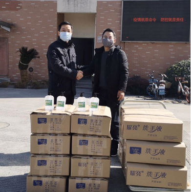 浙江理工大学--绍兴滨海生物医药研究院副院长舒建洪教授代表研究院捐赠500瓶(每瓶500毫升)免洗消毒凝胶(75%酒精),移交给学校公管处处长王尧骏。