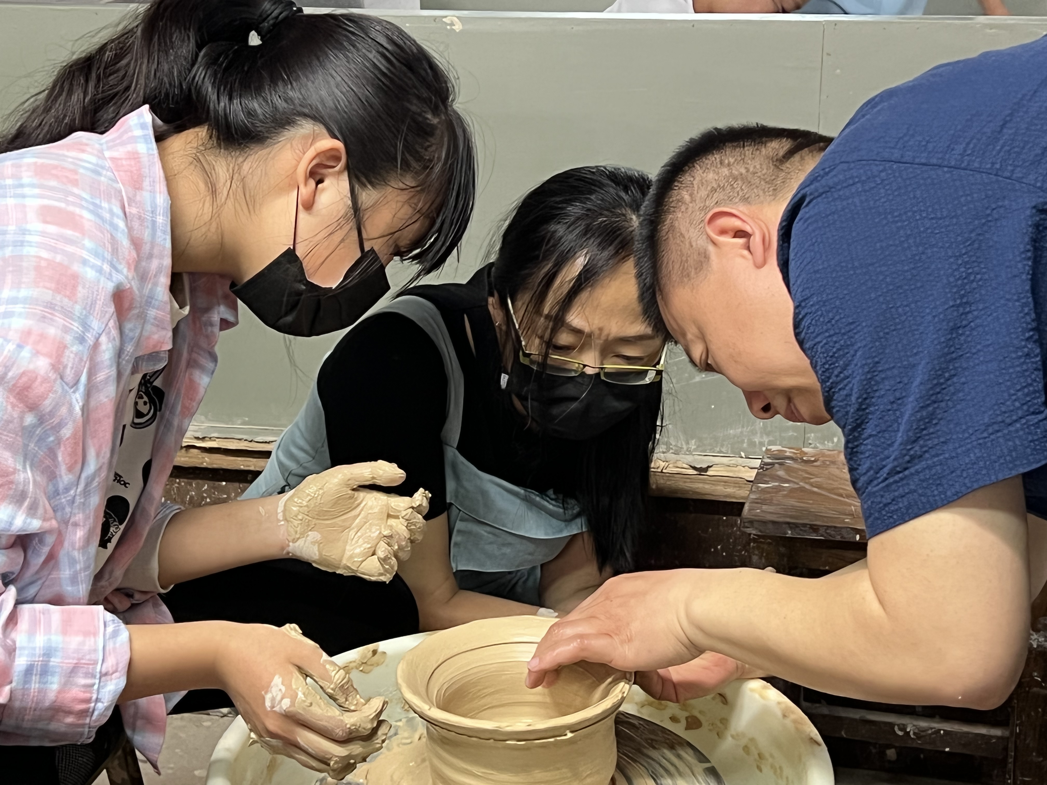 在示范教学环节,熊老师给大家讲解了三种基本陶瓷成型方式:泥条盘筑成型、泥片成型、拉坯成型;介绍了揉泥力度、方向、手法,拉坯时双手摆放的位置、手的湿润度,以及转盘转速和如何找准泥的重心等等。从揉泥到做泥坯,每个环节熊老师都亲自示范、细致讲解。看着坯体在熊老师娴熟双手不同力度的相对挤拉下,呈现出杯、瓶、碗等各种形状的时候,孩子们不禁欢呼雀跃,发出一片“哇哇哇”的赞叹声。