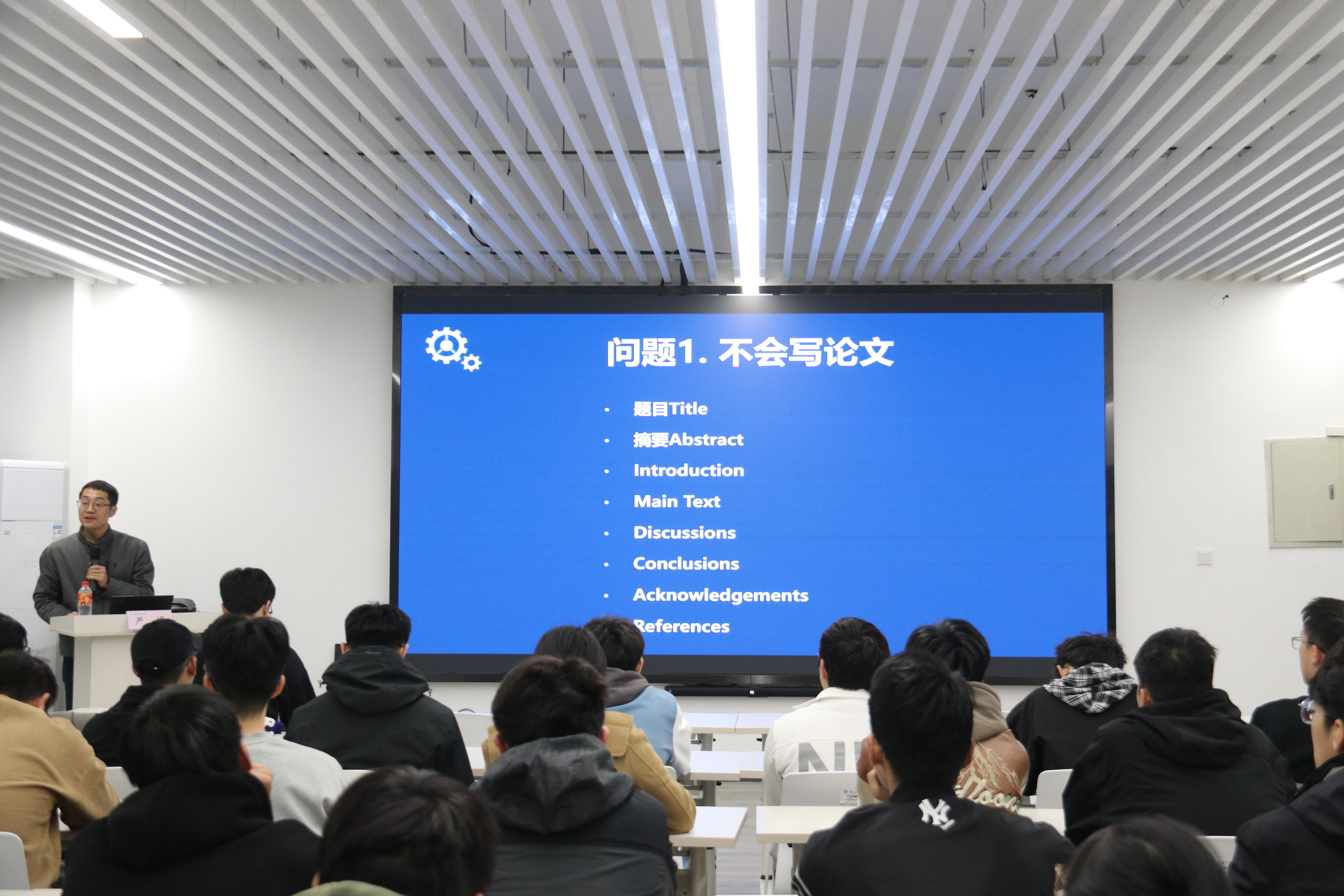 开营仪式结束后,由学院学术副院长严博作《关于科学研究能力提升的一些思考》专题培训,严博从研究生最困惑的七个核心问题出发,围绕论文撰写、文献检索、前沿动态把握、科学问题提出、实验设计、结果分析、创新点挖掘分享具体的方法和技巧,为研究生们指点迷津。