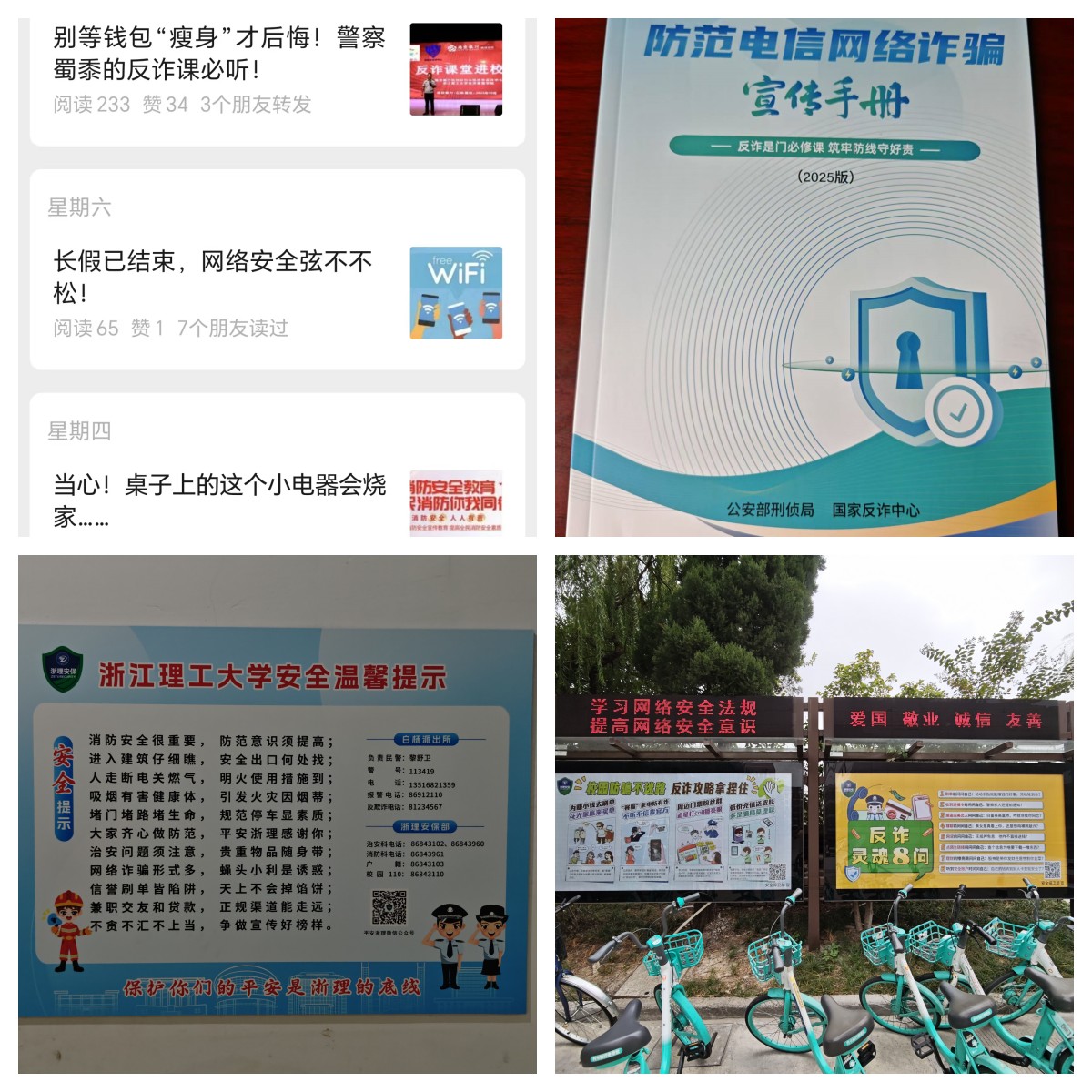 此外,学校积极拓展宣传渠道,依托“平安浙理”微信公众号、校园宣传栏、指示牌等平台,广泛传播防诈知识,营造全员防诈的校园氛围。