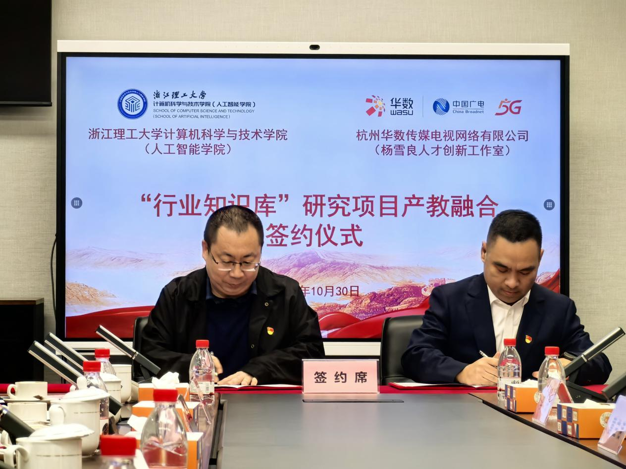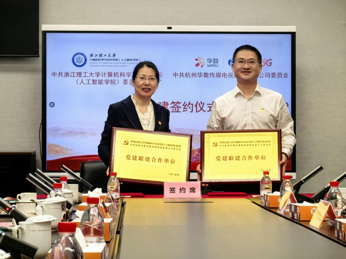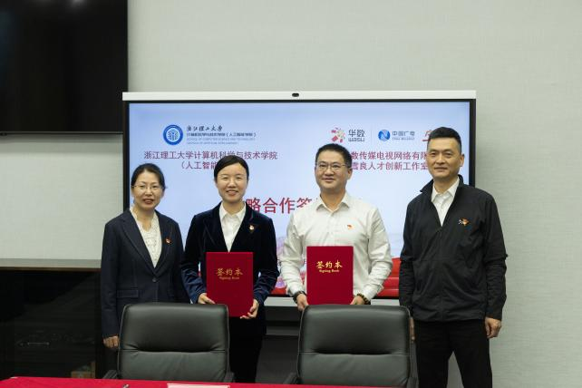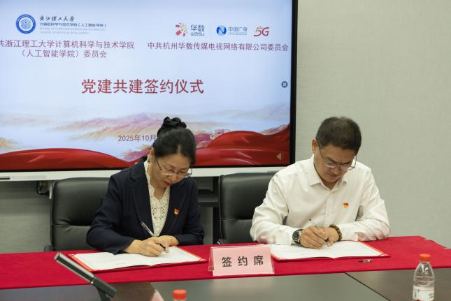 10月30日,浙江理工大学计算机科学与技术学院(人工智能学院)与华数传媒网络有限公司临平分公司在华数产业园举行党建共同体签约仪式暨校企战略合作签约会。华数传媒控股股份有限公司党委副书记、总裁沈子强,临平华数党委书记、执行董事、总经理印天石,党委副书记黄兰洁,党委委员胡佳,财务总监李丹,杨雪良工作室负责人杨雪良,计算机科学与技术学院(人工智能学院)党委书记黄黎,副院长潜睿睿,党委副书记朱敏,学术副院长相东明,专职组织员沈晓斐,青年教师代表马汉杰、张宇等出席活动。