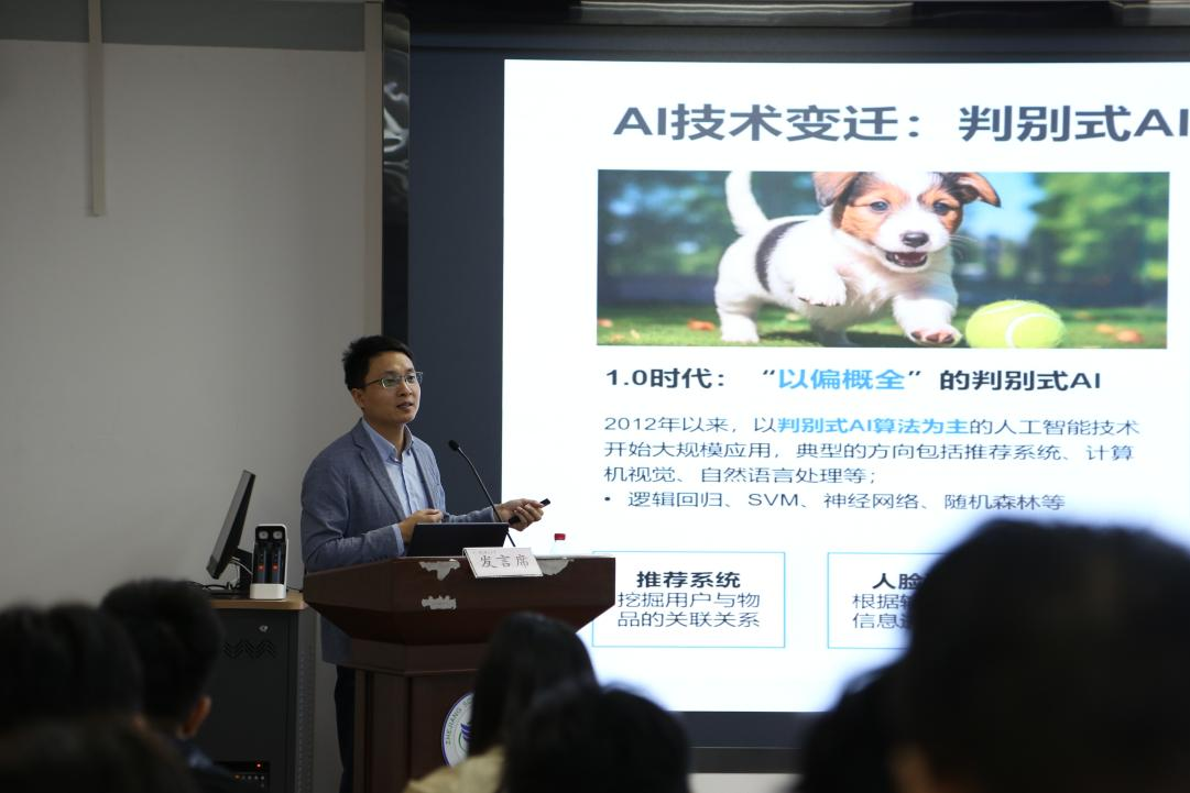 “菁英π计划”学术分享环节,新华三人工智能高级讲师吕昭波以《走进AI世界:从校园Chatbot小助手到AIGC创作探索》为主题,生动讲解提示词生成技巧,现场演示AI生成图片、短视频的实际操作,案例贴近学生生活。互动环节学子踊跃提问,吕老师逐一解答,现场氛围活跃。