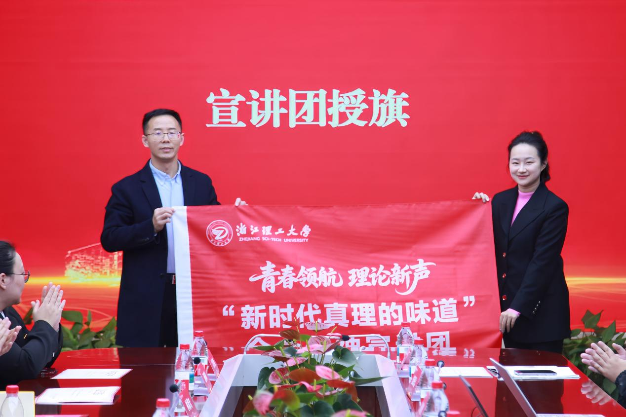 会上,周照东宣布“新时代真理的味道”全会精神宣讲团成立并授旗,校“8090”辅导员新时代理论宣讲团团长汪珊代表“新时代真理的味道”全会精神宣讲团接旗。