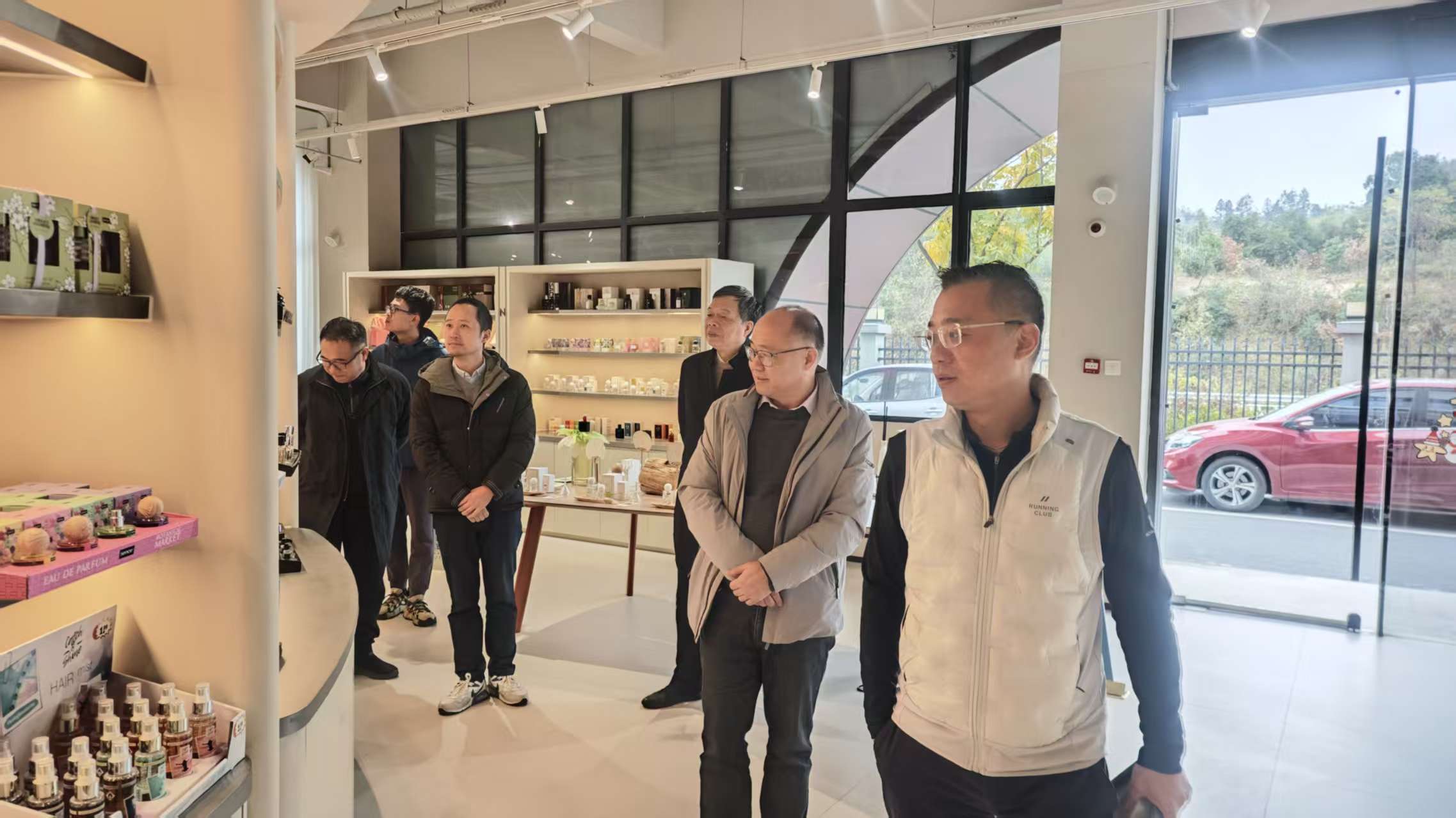 座谈结束后,彭学兵一行参观了公司的直播展厅等地,并代表学院向张城豪赠送学院40周年院庆纪念品。学院副院长黄海蓉、党委副书记赵虎、校友联络中心主任贾梨淙一同参加走访。