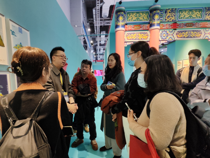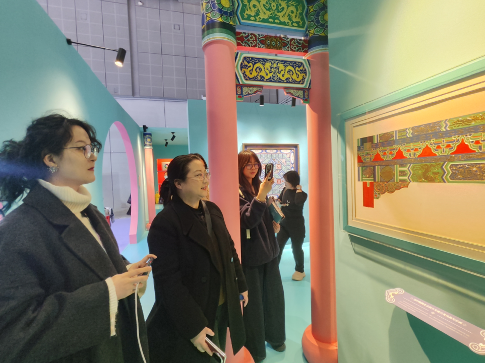 在策展人亲自讲解与带领下,师生们系统梳理了中国传统色彩的体系架构与文化渊源,深入解读色彩背后蕴含的哲学观念,及其在古代建筑彩画、服饰制度与纹样艺术中的演变脉络。这场从色谱出发的文化溯源,让传统美学如何赋能现代设计有了更清晰的路径。