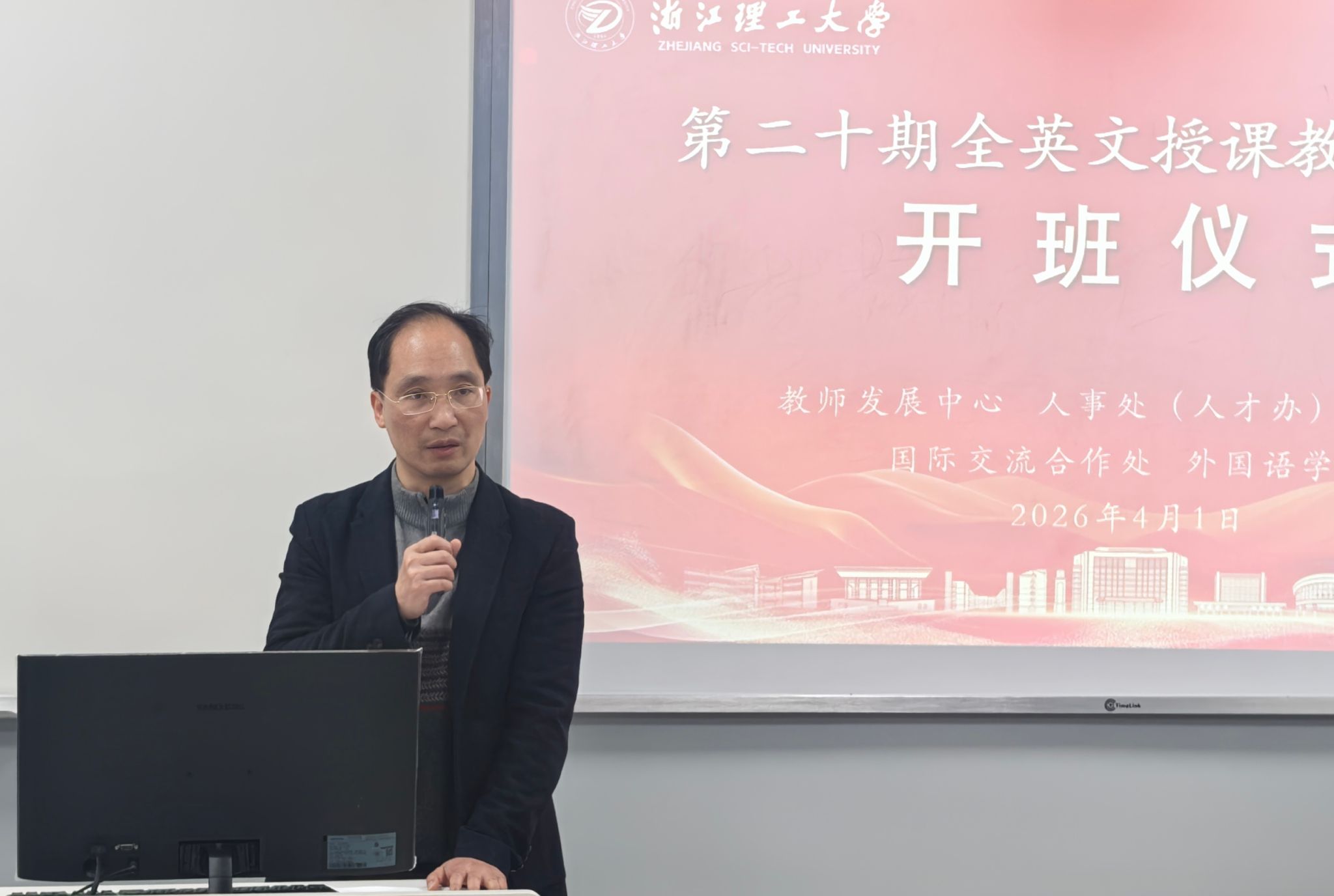4月11日晚上,我校第二十期全英文授课教师培训班开班仪式在下沙校区2S343举行。教师发展中心、人事处(人才办)、教务处、国际交流合作处(港澳台事务办公室)、外国语学院、继续教育学院等单位负责人及授课教师代表出席仪式,本期培训班20名学员共同参加。开班仪式由教师发展中心副主任陈小东主持。