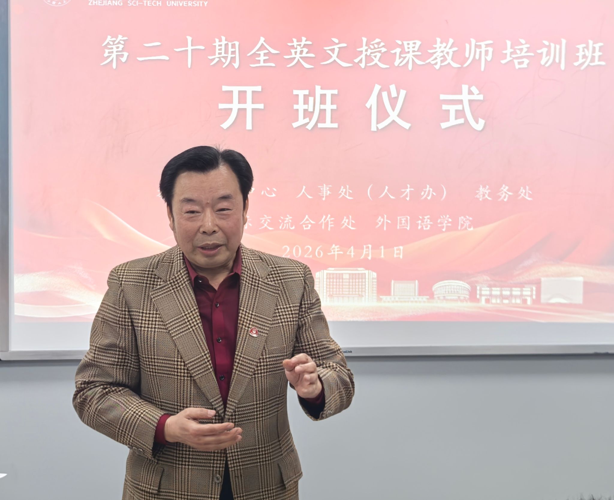 教师发展中心主任楼盛华首先回顾了我校全英文授课教师培训班的办班历程,对培训团队的精心组织、各职能部门的大力支持以及学员的积极参与表示感谢;其次,希望全英授课教师培训团队以饱满的精神状态组织好每次培训,精益求精,充分发挥所长,让学员通过学习能有所思、有所悟、有所得;最后,强调今年是“十五五”开局之年,是学校发展的关键之年,希望学员通过培训提高自身的英语语言技能、跨文化交际能力、教学手段与方法,并将所学运用到全英文教学实践中,教学相长,打造学校教师培训品牌项目,提高人才培养质量,为学校高质量发展添砖加瓦。