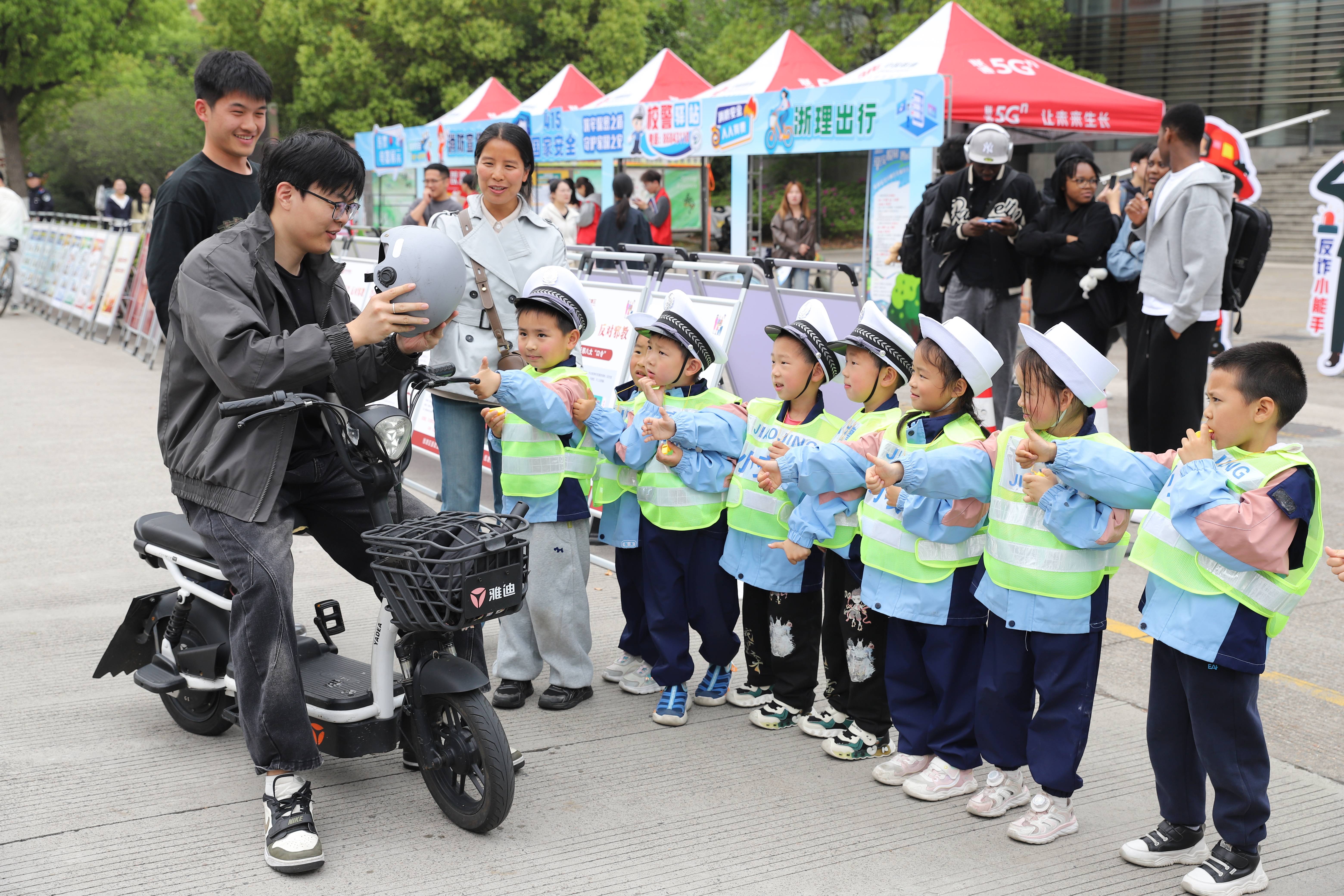 活动中,校地联合开展的“我是小交警”安全主题育人实践同步举行。来自杭州市钱塘区学正幼儿园的萌娃们化身小小交通宣传员,身着迷你交警服饰,以标准规范的交通指挥手势、纯真稚嫩的宣讲话语,向在场师生传递文明出行、遵守交通法规的安全理念,萌态十足的表现引得现场师生纷纷驻足点赞,以别样形式传递交通安全正能量。