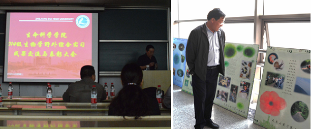 梁宗锁和盛清在参观实习小组的成果展板及听取了各小组同学的汇报后分别进行了总结发言,对本次实习取得的成果感到非常满意。“学生物的人一定要对生态有直观的认识,野外综合实习就是为大家提供一个好的生态认识平台。”梁院长对开展野外实习的意义进行了剖析,获得同学们的一致认可。最后两位领导和与会的指导教师一起对实习过程中表现优秀的个人和团队进行了颁奖。