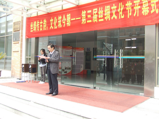 继主持人开场白后,祝成炎为开幕式致辞。他指出:材料与纺织学院作为百年学府浙江理工大学办学特色明显、具有深厚丝绸文化底蕴的学院,举办丝绸文化节对挖掘和弘扬传统的丝绸文化具有十分重要的意义。通过丝绸文化节的开展,我们希望它能够真正成为一个丰富材纺学子专业文化知识、展示材纺学子良好风采的崭新平台。希望广大同学积极参与丝绸文化节系列活动,进一步传承和弘扬丝绸文化的精髓,深入了解专业内涵,结合专业学习与实践,主动了解丝绸及纺织行业发展现状,进一步培养专业素质,增强综合素质,提高就业能力,为更好地锻炼成才、服务社会而不懈努力。