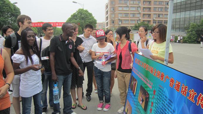根据浙江省语言文字工作委员会等部门下达的第十三届推广普通话宣传周活动通知精神,9月12日—18日为第13届全国推广普通话宣传周,期间文传学院开展了一系列推广普通话宣传活动。在校园里有一件特别引人注目的事情:学校留学生也积极参与到推普宣传活动中,与中国学生一起共同构建和谐的校园语言生活。