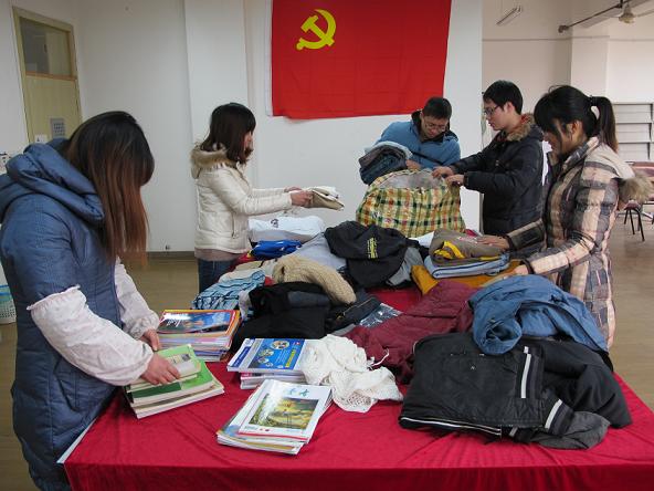浙江理工大学生命科学学院自2009年起设立“爱心中转站”以来,致力于发动师生为困难群体捐助钱物,同时组织师生走进基层社区、农村,开展志愿实践服务。图为“爱心中转站”组织师生为四川、甘肃、贵州等贫困地区失去亲人的儿童捐助衣物、书籍。(本报通讯员 胡知渊 孙亦灵 摄)