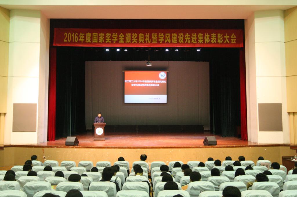 5月17日下午,我校2016年国家奖学金颁奖典礼暨学风建设先进集体表彰大会在活动中心小剧场举行。校党委副书记周文龙,党委学工部、党委研工部、教务处、招就处和校团委等职能部门负责人出席大会。各学院学生工作负责人、辅导员、国家奖学金和省政府奖学金获得者,学风建设先进集体代表和各班班级代表参加此次大会。