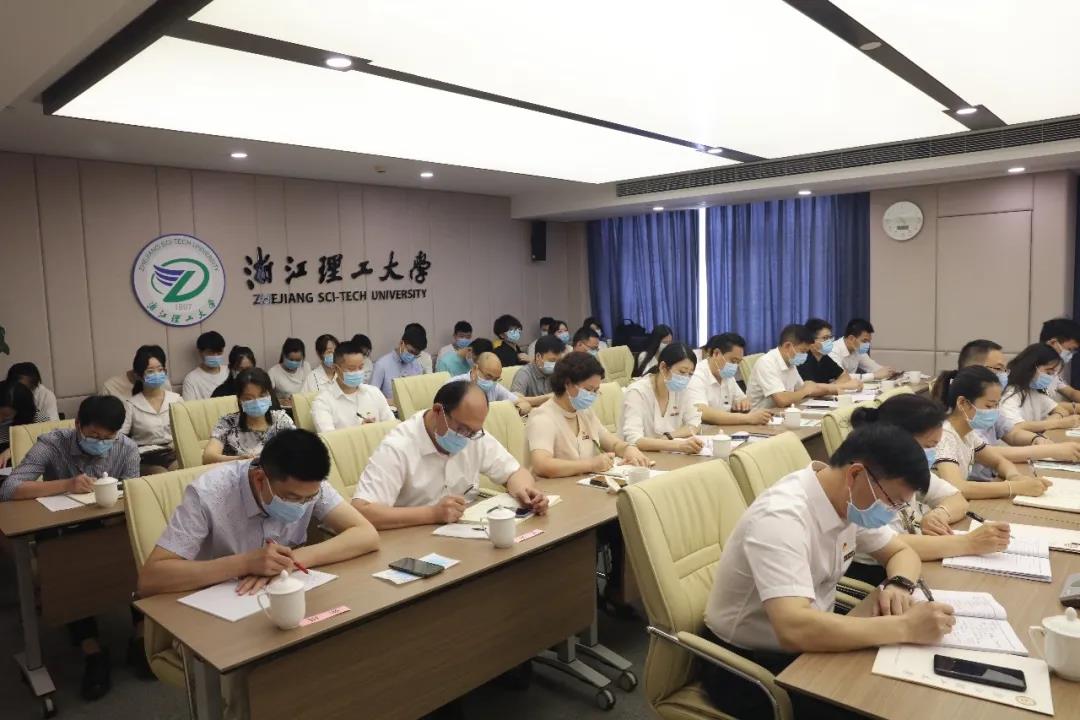 专题党课前,卢山一行参观了校史馆(丝绸博物馆)、先进纺织材料与制备技术教育部重点实验室,通过1897年蚕学馆创办以来的丝绸纺织发展史,了解了学校百年发展历程,听取了液相增黏熔体直纺涤纶工业丝生产新技术及产品、聚四氟乙烯(PTFE)组件和装置、抗疫用口罩和防护服研制生产、纺机互联互通与网络化制造技术等情况介绍。