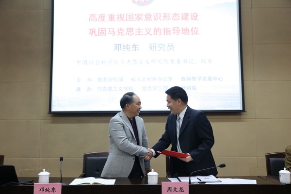 4月13日下午,中国社会科学院马克思主义研究院党委书记、院长邓纯东研究员的兼职教授聘任仪式在我校行政楼二楼报告厅举行。校党委副书记周文龙,党委委员、党委宣传部部长杜兰晓,人事处副处长吕品等出席聘任仪式。聘任仪式由马克思主义学院院长渠长根主持。