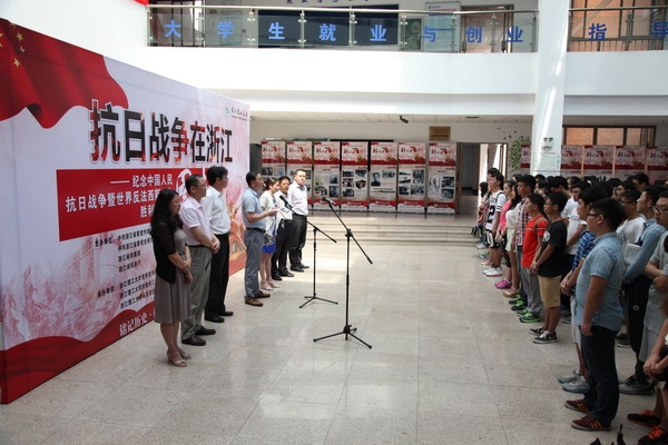 9月10日上午,我校在学生活动中心举行了“抗日战争在浙江——纪念中国人民抗日战争暨世界反法西斯战争胜利70周年图片展”开幕式。