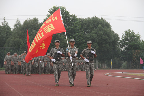 五星红旗伴随着雄壮的国歌冉冉升起,在军训团团长姜东东的陪同下,院长王兆青院走下主席台检阅部队标兵。紧接着,分列式表演开始,护旗手昂首阔步走在方阵最前面,6个营18个排的学员们穿着整齐的迷彩服,喊着嘹亮的口号,依次迈着正步走过主席台,接受领导和教官的检阅。随后,各营相继展示了军体拳、旗语表演等军训成果,来自观众席的掌声此起彼伏。