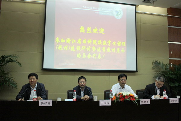 陈建勇代表学校对来宾的到来表示热烈欢迎,并介绍了我校的发展历程、办学特色以及推进数字化课程(教材)建设的举措和成效。王国银在讲话中立足教育国际化、信息化的高度,深刻分析了教材建设存在的问题,并提出了教材建设的思路与努力方向,要求切实加强数字化课程(教材)建设,不断提高人才培养质量。楼程富介绍了近年来浙江省数字化课程(教材)建设取得的进展,并就信息化发展对课程、教材建设、教学模式改革提出的挑战与机遇谈了教材专业委员会的工作思路与举措,希望高校与出版社加强合作,推进我省的数字化课程(教材)建设进程,提升水平。