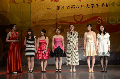 为更好迎接第二十二次“全国助残日”,5月19日下午,在浙江省和杭州市残联的指导下,由我校大学生手语志愿服务社发起的以“爱传心语,手舞天籁”为主题的浙江省第八届大学生手语爱心汇演在我校国际会展中心举行。浙江省残疾人劳动就业服务中心副主任黄诗弟,省残疾人劳动就业服务中心中国手语培训(浙江)基地负责人董慧芳,我校手语社第一任社长、社团指导老师苏丽辉和校团委及信息学院相关负责人出席活动,全省13所高校的手语爱心社团参加了汇演,部分结对残疾人家庭成员也来到活动现场与志愿者们现场互动,气氛十分融洽。