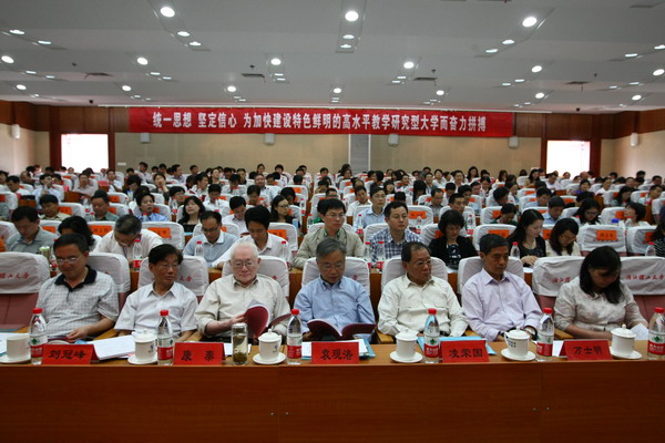 校长裘松良在大会上作了题为《统一思想 坚定信心 为加快建设特色鲜明的高水平教学研究型大学而奋力拼搏》的工作报告。报告回顾了学校2011年主要工作:一、编制完成学校“十二五”规划,顶层设计更趋完善;二、教育教学质量稳步提升;三、学科建设与科研工作成绩显著;四、国际化办学程度和水平不断提高;五、人才和师资队伍建设富有成效;六、管理水平和服务保障能力不断提升;七、思想政治工作得到加强。在充分肯定成绩的同时,裘松良指出,我们必须清醒地认识到,学校还存在着一些困难和问题,需要我们认真采取对策,加以有效解决。随后他分析了我校面临的形势,并明确了主要任务。他强调,为实现学校宏伟目标,一是必须进一步抓好重点工作,主要有:着力提高人才培养质量,着力提升科技与文化工作水平,着力促进多学科协调发展,突出学科特色和优势,着力提升国际化办学程度,着力加强师资队伍建设,着力建设优良教风、学风和校风。二是必须进一步提升保障水平,首先要确保学校事业发展始终拥有政治、思想、组织与干部队伍、团结和谐等强大的力量源泉;其次要着力做好三方面的工作:一、积极推进体制机制改革和现代大学制度建设;二、努力改善办学条件;三、不断加强教代会、工会工作。