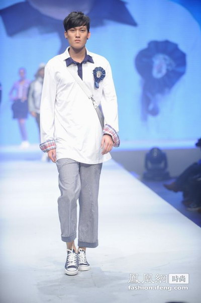 夏霞的作品《转校生》设计灵感来源于英美校园剧,将校园的元素融入设计,塑造了转校生年轻朝气、个性强且有点叛逆的形象。面料以棉、针织、休闲牛仔为主,运用镶边的细节及衬衣、领带、休闲西装外套的搭配元素;色彩上运用在蓝灰的基调上加入微量的亮彩。该作品彰显了青年人追求时尚、个性和活力,很好地诠释了“梦飞扬”的设计主题,体现了青春的张扬与激情,对美好生活的向往。