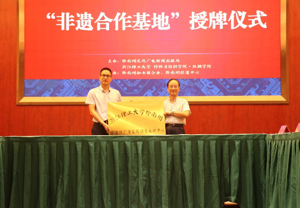会上举行了“浙江理工大学黔南州非遗推广与创意设计中心”和“浙江理工大学大学生社会实践基地”的授牌仪式。祝成炎向黔南州文广新局局长郭兴文颁发铜牌并合影留念。