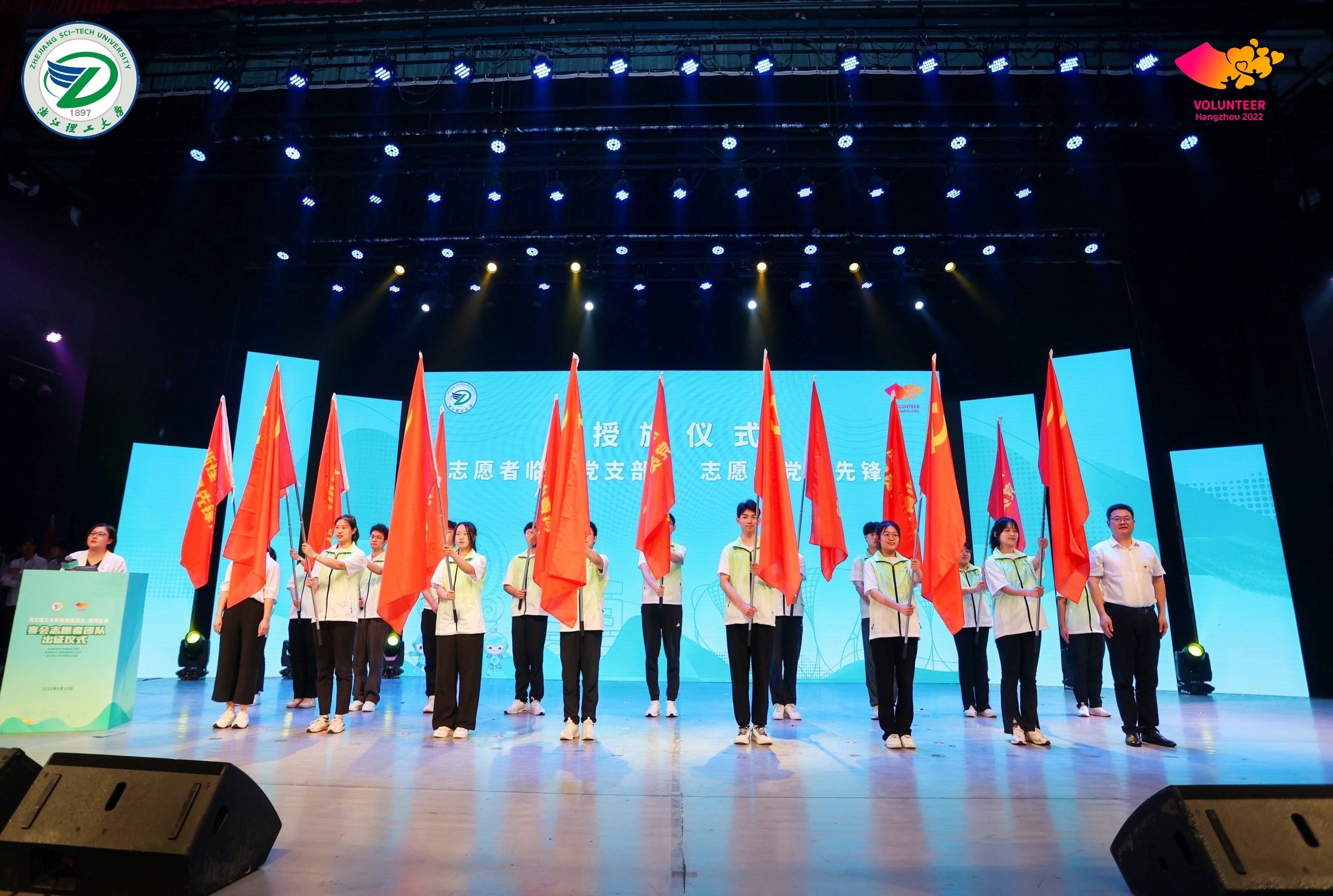 亚运有我,扬梦浙理。2000余名浙理“小青荷”已经整装待发,活动现场成立了21支志愿者团队,6个亚运会志愿者临时党支部,10支志愿者党员先锋队,10支志愿者团员青年突击队,杭州亚组委志愿者部综合处、浙江理工大学相关职能部门负责人分别为团队授旗,让党旗、团旗在亚运场馆志愿服务的一线高高飘扬,让青春在志愿服务中绽放绚丽之花。