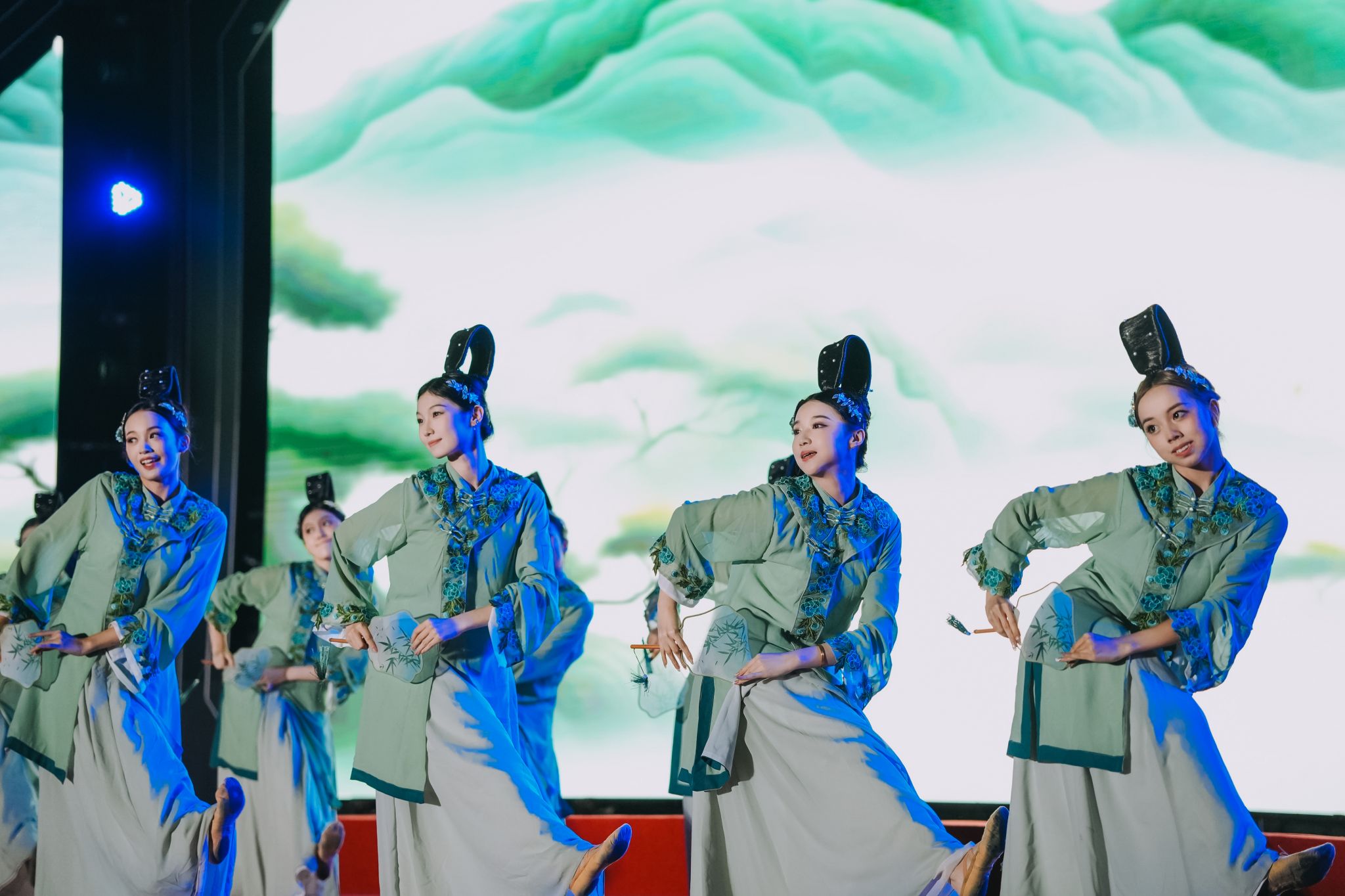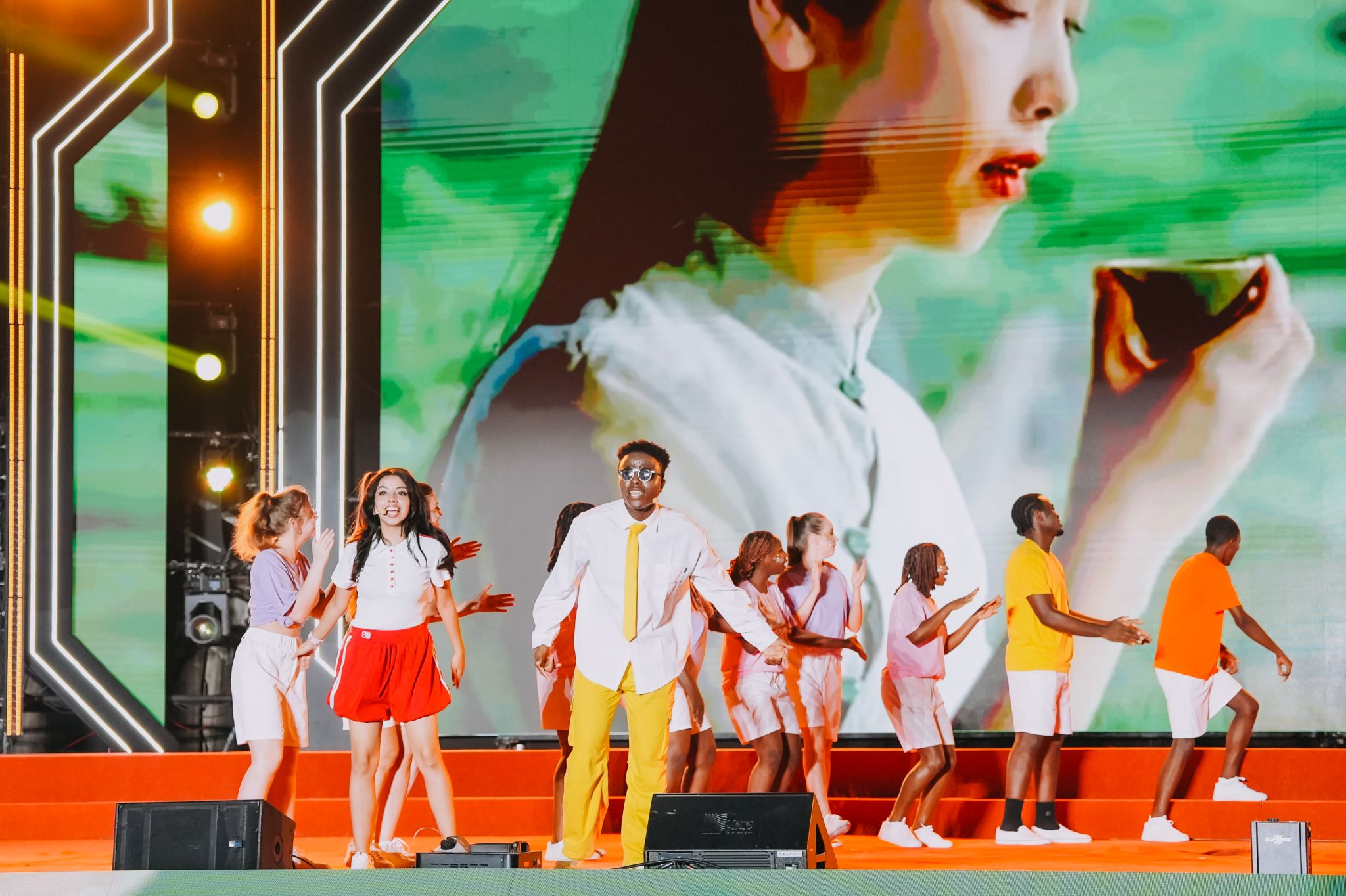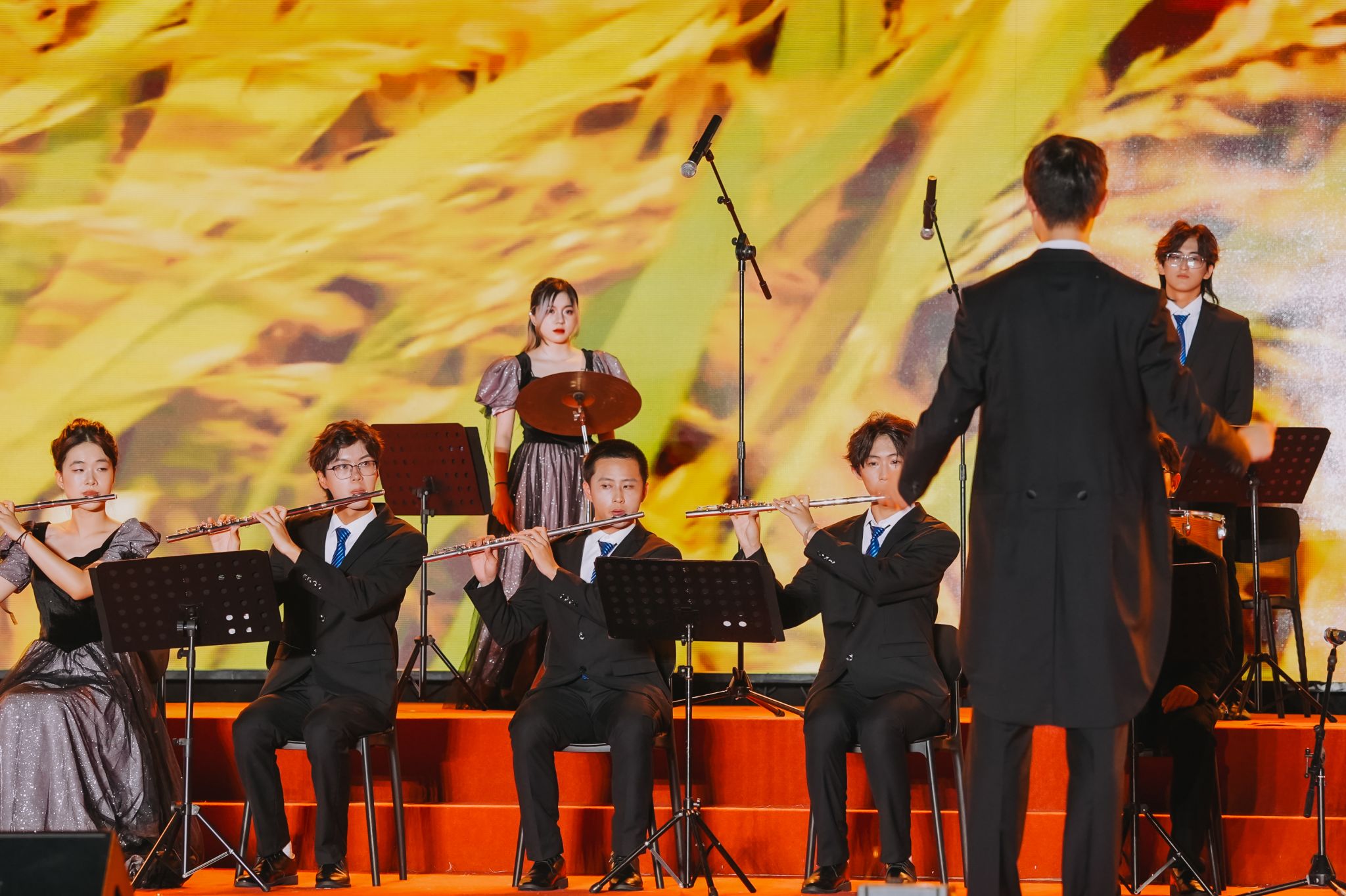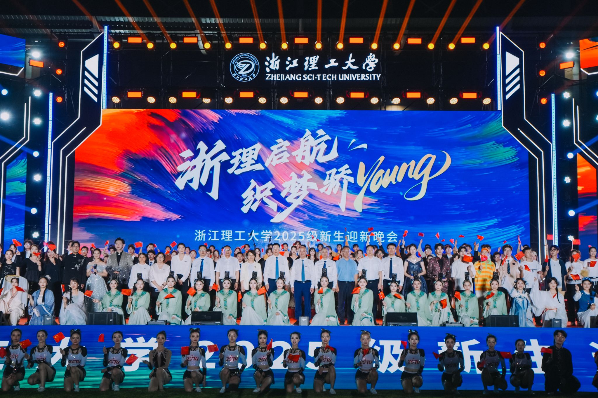 开场情景说唱《浮光起航》以校园日常为蓝本,生动演绎丰富多彩的大学生活;啦啦操与武术融合的《武“舞”悦青春》,尽显浙理学子刚柔并济的青春活力;校大艺团民乐分团《民乐嗨不停》用传统乐器奏响现代韵律;舞蹈分团《清风徐来》以婀娜舞姿勾勒江南灵秀,《阳光下的麦盖提》则用欢快舞步传递民族风情;声乐分团《逐光新声》歌曲串烧选取学生喜爱的流行曲目,引爆全场,《爱就一个字》温情流转,满含对新生的美好期许;新生辅导员代表演唱《少年中国说》,铿锵歌声激荡学子共鸣;街舞表演《新生,“星”印象》,利落动作点燃全场热情;留学生歌舞《我们在“浙”里等你》彰显国际范儿;《时尚浙理》时装秀展现我校时装表演艺术专业实力,科技感灯光让舞台宛如梦幻星河。晚会在西洋乐分团《丰收》的悠扬乐声中进入尾声,为纪念抗战胜利80周年,全场师生共同唱响《歌唱祖国》,激昂旋律回荡学校上空,为迎新晚会画上圆满句号。