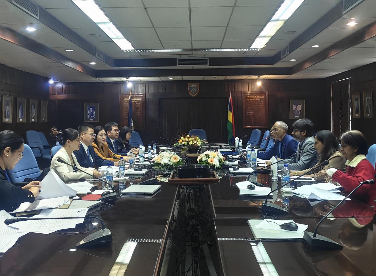 在毛里求斯期间,赵全军一行访问了毛里求斯大学,共同召开毛里求斯大学孔子学院第八届理事会,毛里求斯大学代理校长穆罕穆德∙伊萨克∙桑塔利教授及理事会成员参加会议。会议传达学习了国家主席习近平关于建设好孔子学院的重要指示精神,听取并审议了孔子学院上一年度工作总结、财务报告以及本年度工作计划与预算。双方围绕加强科研教学合作、共同开创国际中文教育新局面等议题进行了深入交流。桑塔利对代表团的到访表示热烈欢迎,他表示,毛里求斯大学将继续深化与浙江理工大学的合作,共同推动中毛教育文化交流事业高质量发展。
