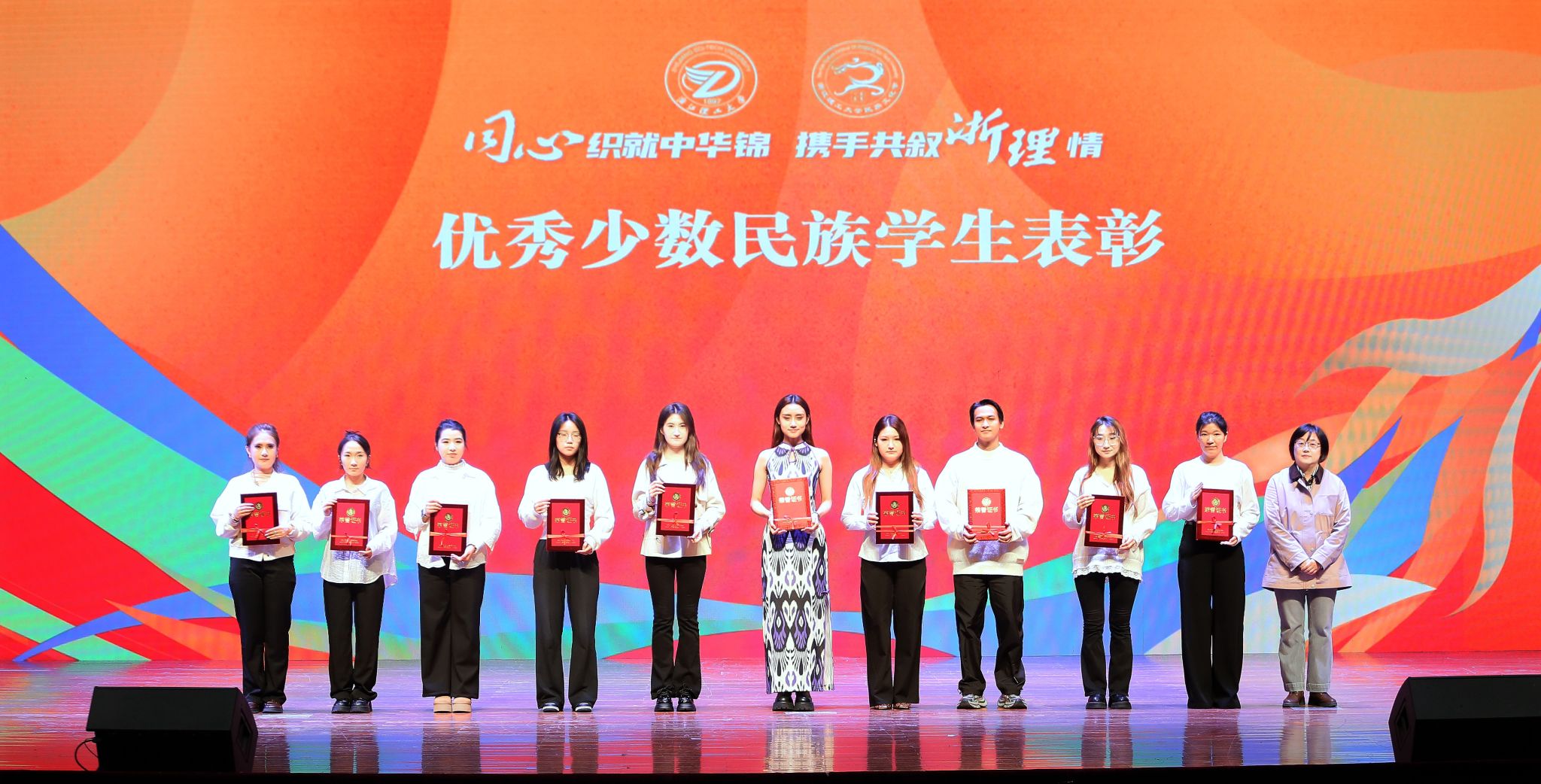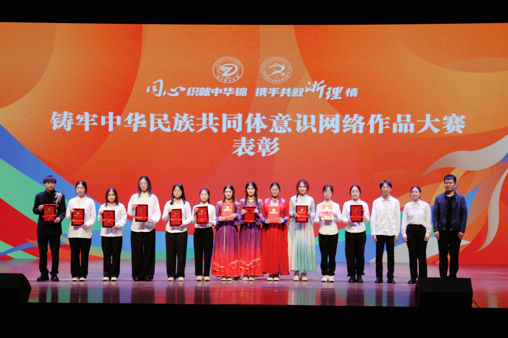开幕式上,表彰了我校在铸牢中华民族共同体意识网络作品大赛、知识竞赛中脱颖而出的学生,以及一批德才兼备的优秀民族学生。他们用镜头讲述民族团结故事,用笔尖书写理论学习心得,用行动诠释新时代青年的责任与担当,充分展现了浙理学子昂扬向上的精神风貌。