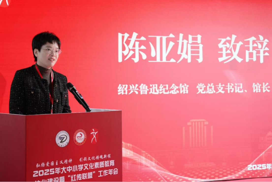 为深入学习贯彻党的二十届四中全会精神,自觉担负起文化育人使命,推进“文化创新创造”走深走实,11月27日,由中国高等教育学会大学素质教育研究分会和浙江省大中小学思想政治教育一体化建设联盟共同指导,大中小学红色文化一体化传承联盟、大中小学文化素质教育一体化建设联盟与浙江理工大学科技与艺术学院联合主办的2025年大中小学文化素质教育一体化建设暨“红传联盟”工作年会在绍兴鲁迅纪念馆举行。中国高等教育学会大学素质教育研究分会副理事长、浙江理工大学党委副书记姚珺,浙江省鲁迅研究会名誉会长、浙江大学教授黄健,全国高校思政课教学指导委员会委员、浙江省高校红色场馆联盟理事长、浙江理工大学教授渠长根,延安大学马克思主义学院副院长刘建华,延安大学鲁迅艺术学院副院长兰庆炜,绍兴鲁迅纪念馆党总支书记、馆长陈亚娟,浙江省教育宣传中心综合期刊部主任兼《高校思想政治工作》杂志主编王东等嘉宾出席活动。