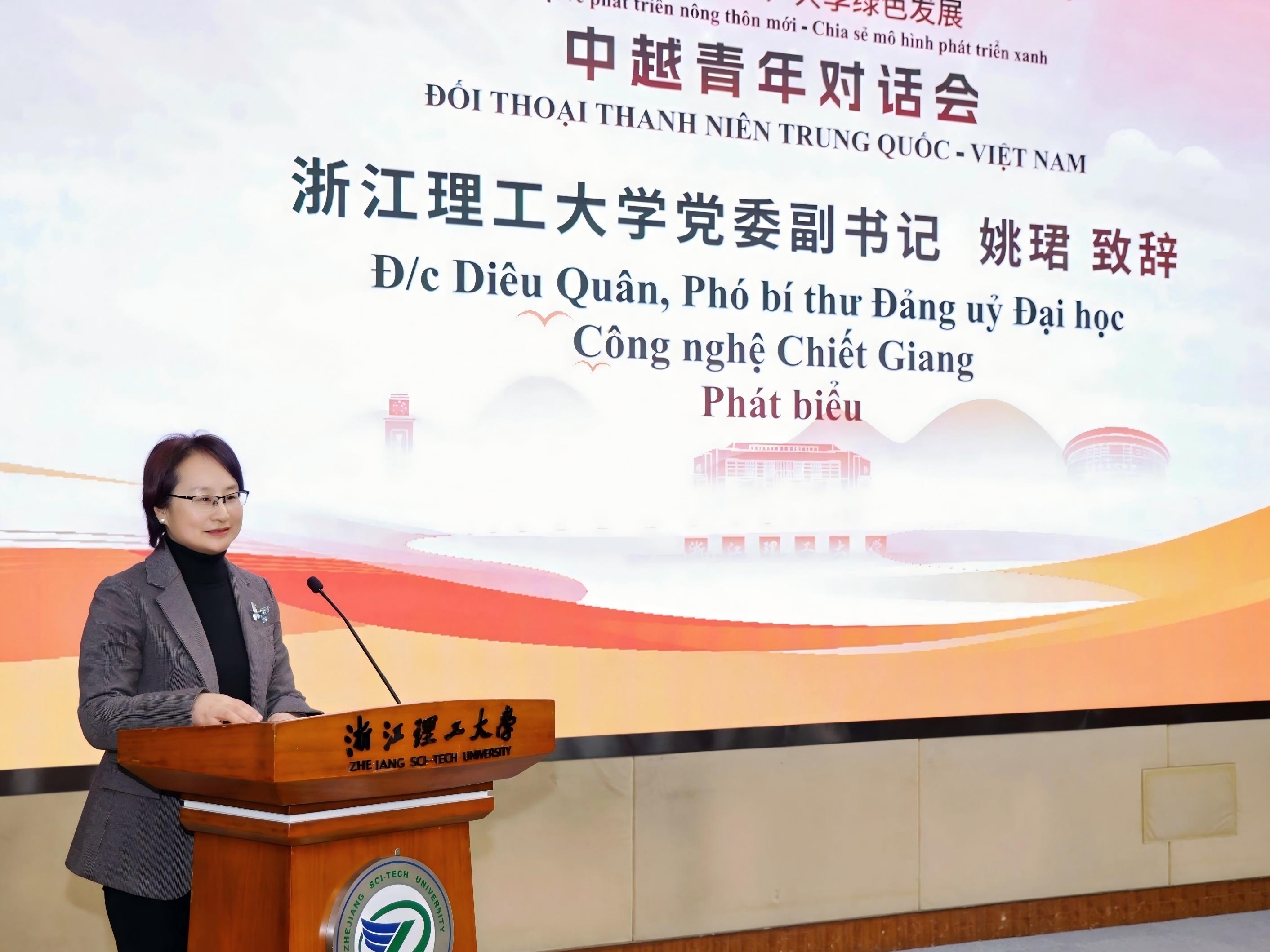 姚珺致辞。她代表学校对越南青年研学团表示欢迎。她简要介绍了浙江理工大学的基本校情,重点介绍了学校在服务区域发展和乡村振兴等方面的特色做法。她指出,中越两国在推动乡村振兴和绿色发展方面拥有许多共通之处和合作空间,希望两国青年以此次活动为契机,深入对话、彼此倾听,探索更多有价值的合作构想,并转化为造福两国人民的务实成果,为构建具有深远战略意义的中越命运共同体贡献青春力量。