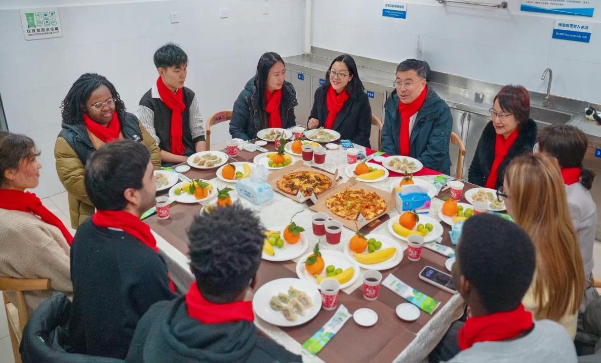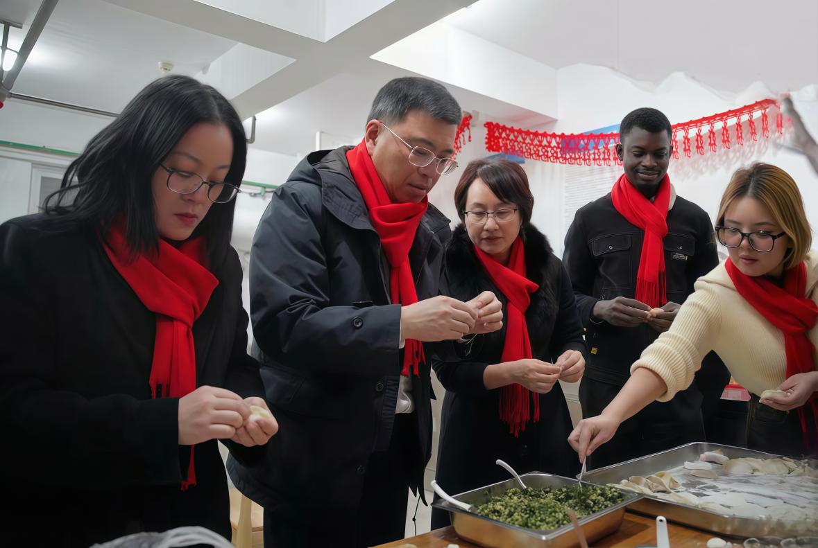 舒培冬一行走进国际学生迎新年活动现场,与师生们一同包饺子、迎新春,并为学生们送上暖心礼包。来自刚果(金)、津巴布韦、土库曼斯坦、乌兹别克斯坦、塔吉克斯坦、朝鲜等国的国际学生代表围坐桌旁,认真学习包饺子的手法,现场氛围欢乐而融洽。