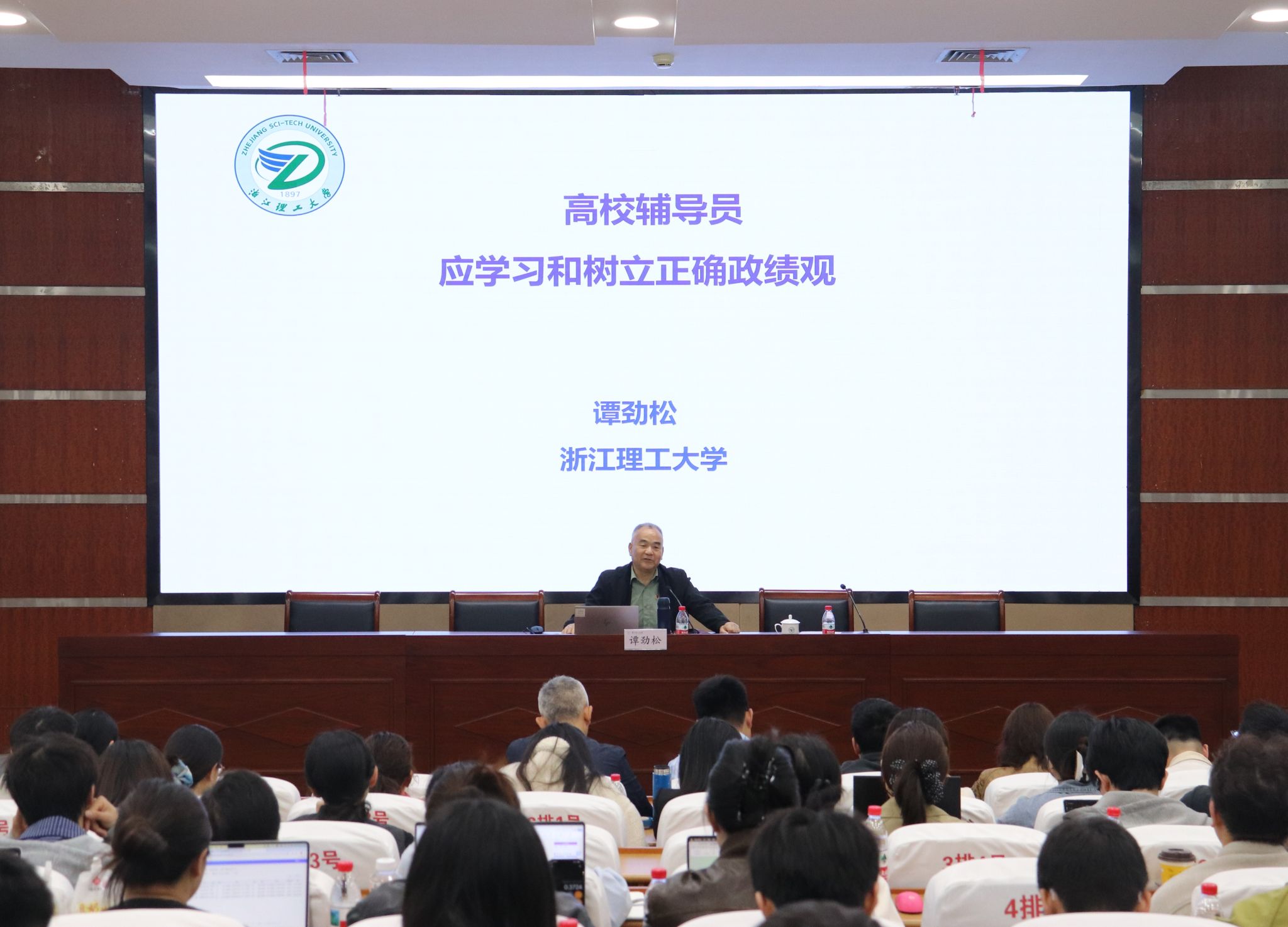 开班仪式后,浙江省教学名师、浙江省功勋教师、全国优秀教师谭劲松教授作《高校辅导员应学习和树立正确政绩观》专题讲座,他以“树什么样的政绩”“政绩为谁而树”“靠什么树政绩”三个核心问题为主线,系统阐述了辅导员在立德树人工作中如何科学认识、准确树立、有效落实正确的政绩观,为全体学员提供了深刻的理论启迪与实践指导。