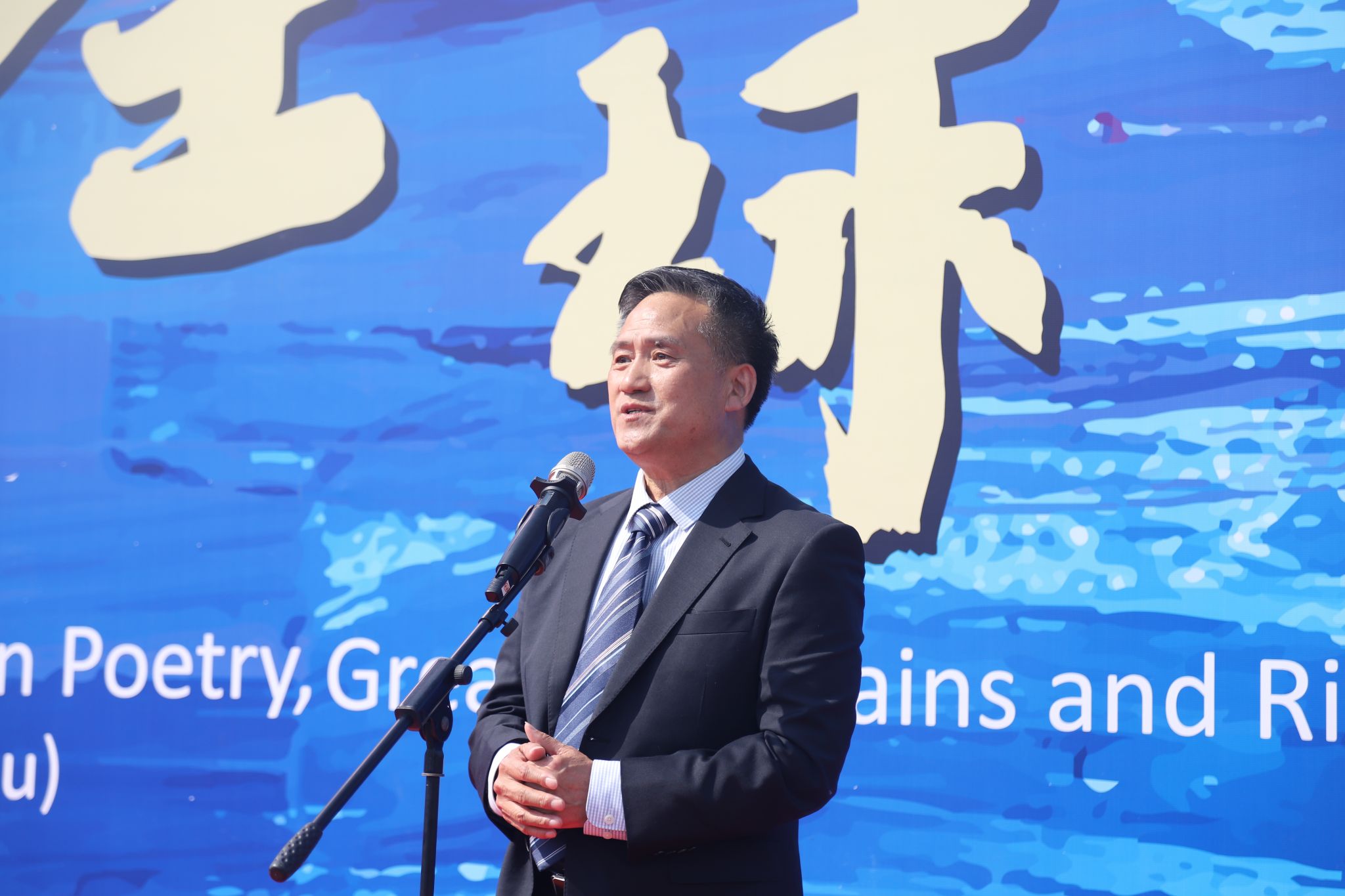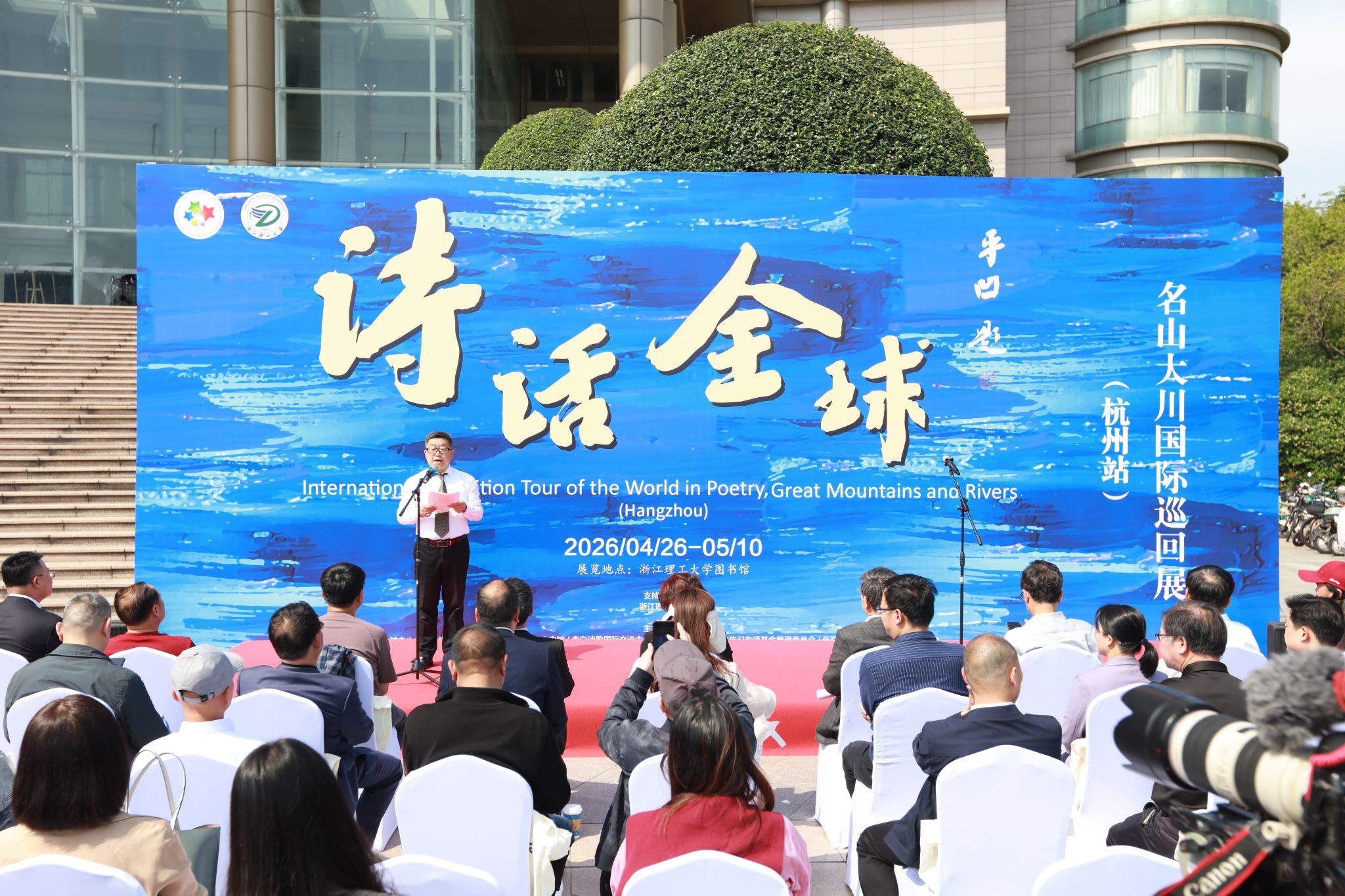 4月26日,“诗话全球名山大川国际巡回展”(杭州站)在浙江理工大学下沙校区图书馆一楼广场举行开展仪式。浙江理工大学党委副书记姚珺,浙江省文史馆馆长、浙江省人大常委会原副主任王永昌,全球中小企业联盟执行主席兼秘书长、德国前总统武尔夫中国事务顾问、李白诗歌国际交流中心主任、校友曹方出席仪式。