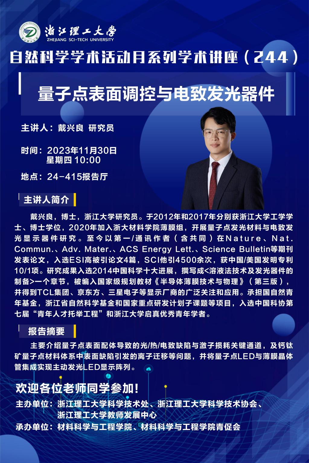 戴兴良,博士,浙江大学研究员。于2012年和2017年分别获浙江大学工学学士、博士学位,2020年加入浙大材料学院薄膜组,开展量子点发光材料与电致发光显示器件研究。至今以第一/通讯作者(含共同)在Nature、Nat. Commun.、Adv. Mater.、ACS Energy Lett.、Science Bulletin等期刊发表论文,入选ESI高被引论文4篇,SCI他引4500余次,获中国/美国发明专利10/1项。研究成果入选2014中国科学十大进展,撰写成<溶液法技术及发光器件的制备>一个章节,被编入国家级规划教材《半导体薄膜技术与物理》(第三版),并得到TCL集团、京东方、三星电子等显示厂商的广泛关注和应用。承担国自然青年基金,浙江省自然科学基金和国家重点研发计划子课题等项目,入选中国科协第七届“青年人才托举工程”和浙江大学启真优秀青年学者。