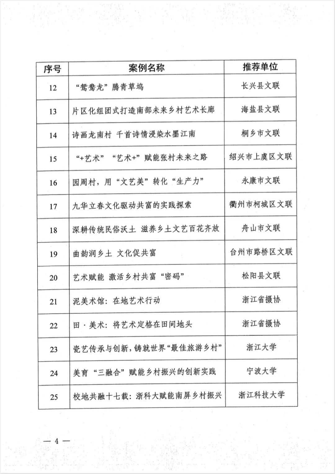为深入学习贯彻党的二十届三中全会和省委十五届六次全会精神,深入践行“千万工程”,加快推进人文乡村建设,进一步激发广大文艺工作者和乡村群众投身“艺术乡建”的热情,根据《关于开展“艺术乡建”助力共同富裕的指导意见》,经研究,浙江省文联组织开展了2025年度“艺术乡建”典型案例征集评选和“艺术乡建”带头人推荐工作。