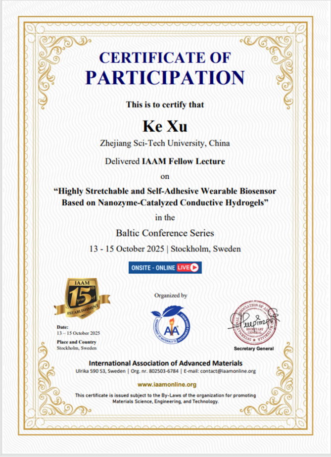 10月13-15日,国际先进材料学会(IAAM,International Association of Advanced Materials)在瑞典首都斯德哥尔摩召开第66届国际先进材料大会波罗的海系列会议(Baltic Conference Series)。本次大会共收到来自30多个国家的251篇论文摘要,经过严格评审,最终邀请了71位优秀专家进行演讲。生命科学与医药学院徐科博士应邀做了名为“Highly Stretchable and Self-Adhesive Wearable Biosensor Based on Nanozyme-Catalyzed Conductive Hydrogels”的专题在线报告,着重介绍了基于纳米酶催化的凝胶生物传感器在可智能穿戴领域的最新研究进展。