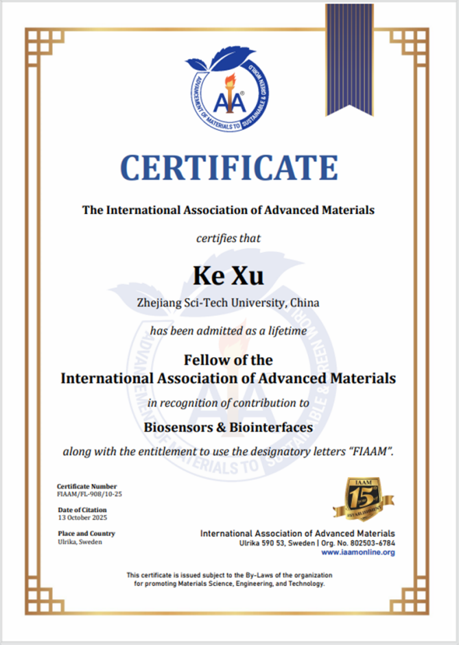 会后,国际先进材料学会(IAAM)授予徐科博士 “终身会士”(Lifetime Fellow)的荣誉称号,以表彰其在生物传感器和生物界面领域做出的突出贡献。