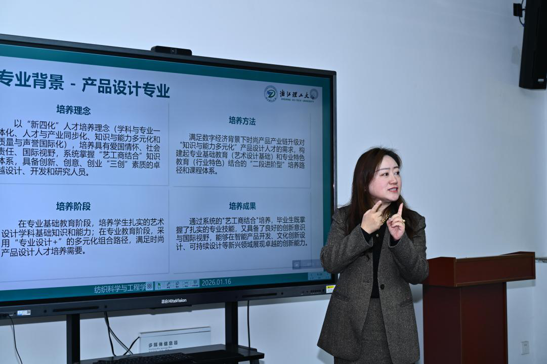 在丝绸设计与工程专业“工学+艺术学”双学士学位复合型人才培养项目论证会环节,苏淼书记就该项目的依托专业基本情况、培养模式、课程与教学体系、学科资源支持等方面作了可行性汇报。