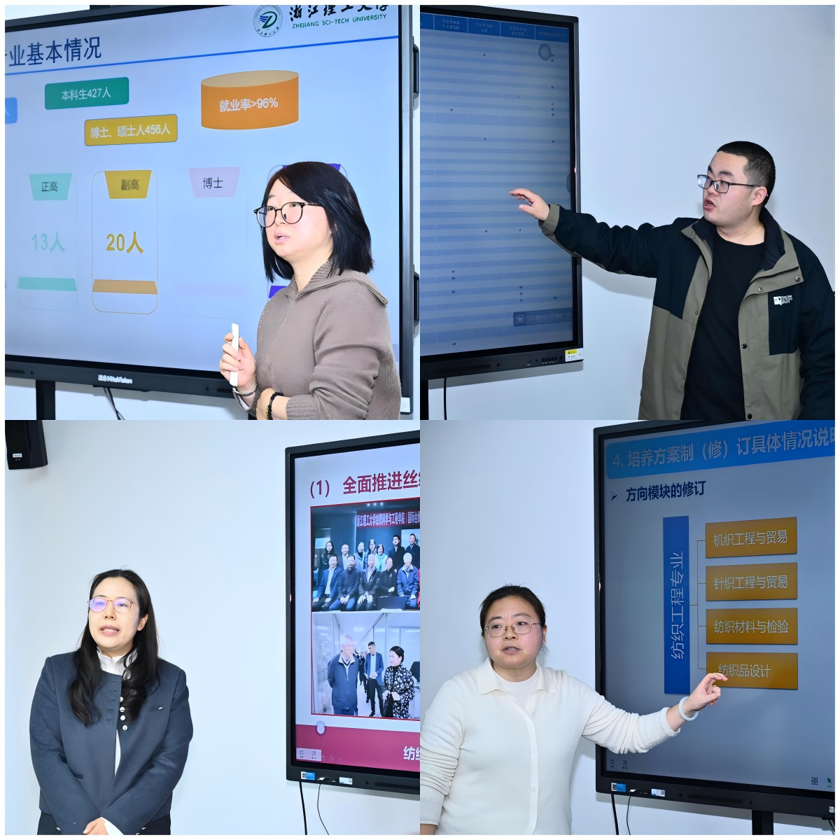 在国家级一流本科专业建设研讨会环节,纺织工程系主任田伟、非织造工程系主任李祥龙、纺织品(丝绸)设计系主任鲁佳亮分别围绕各专业的发展现状、建设举措、特色成效及未来规划作了系统汇报。在2026级本科人才培养方案论证会环节,纺织材料系副系主任李妮、李祥龙、鲁佳亮分别汇报了各专业人才培养方案的修订思路、主要变化与改革举措。